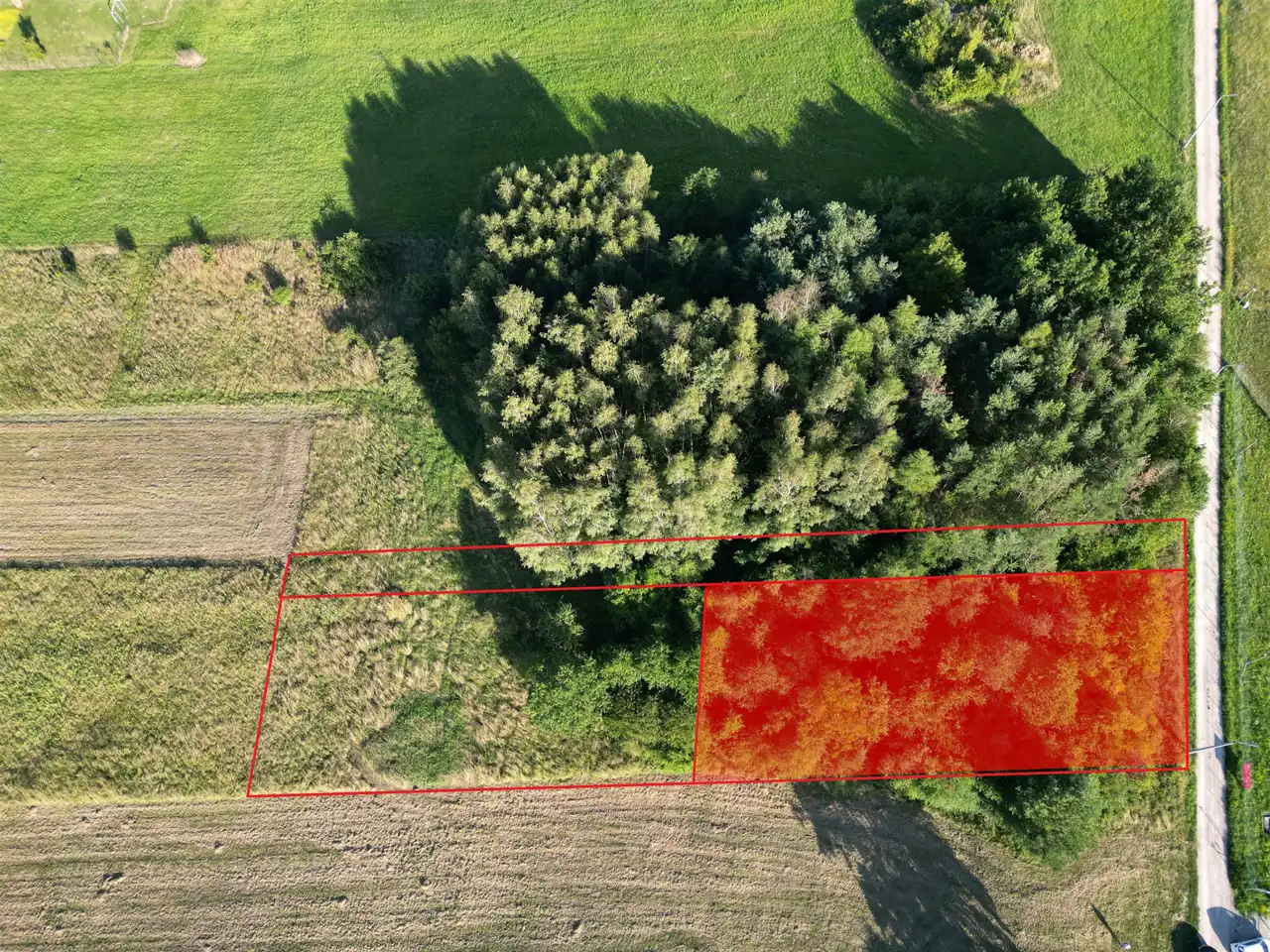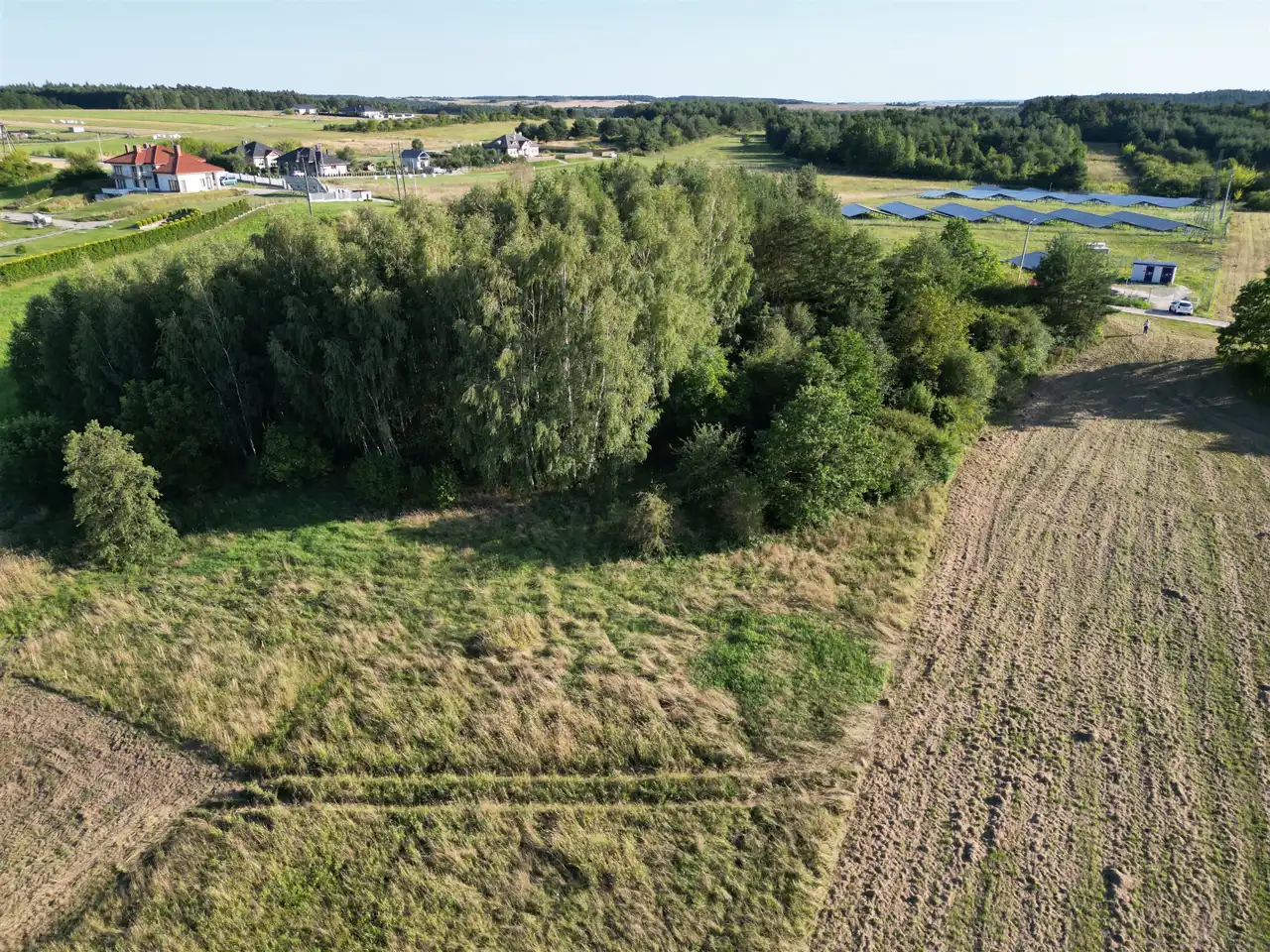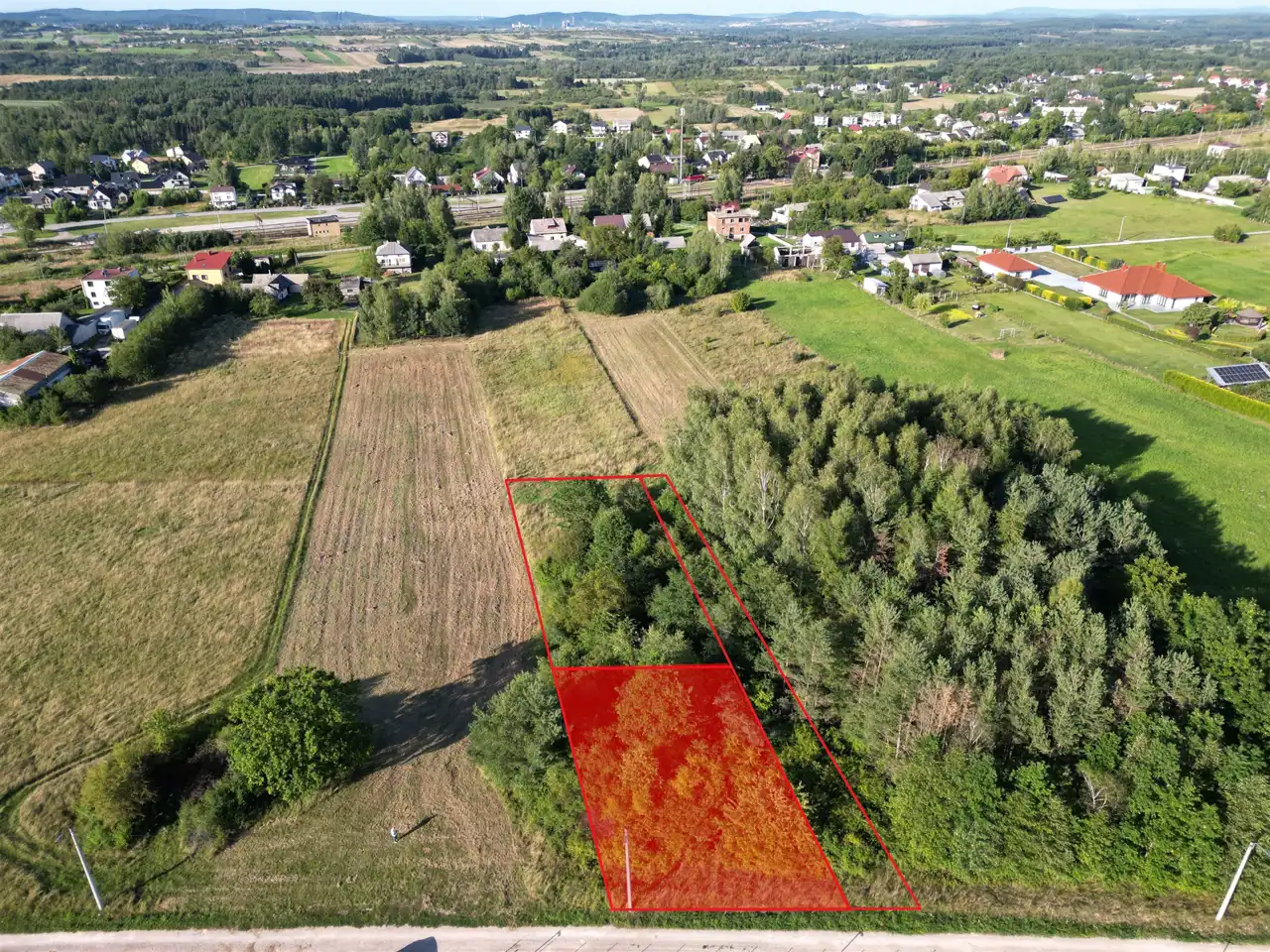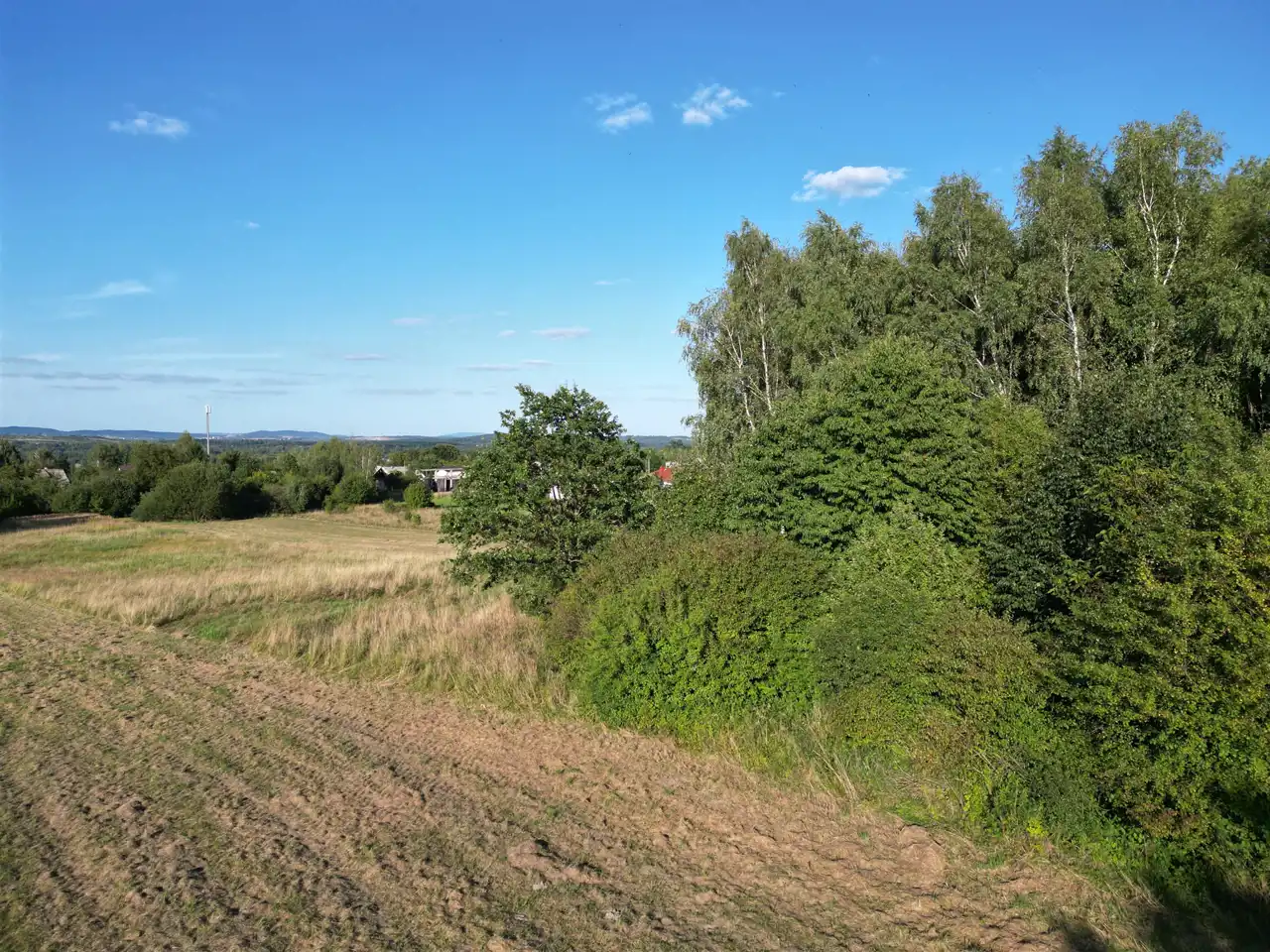 Access to the property via a paved road. The plot is flat, undeveloped, covered with bushes, rectangular in shape, offering a view of the Chęciny panorama.