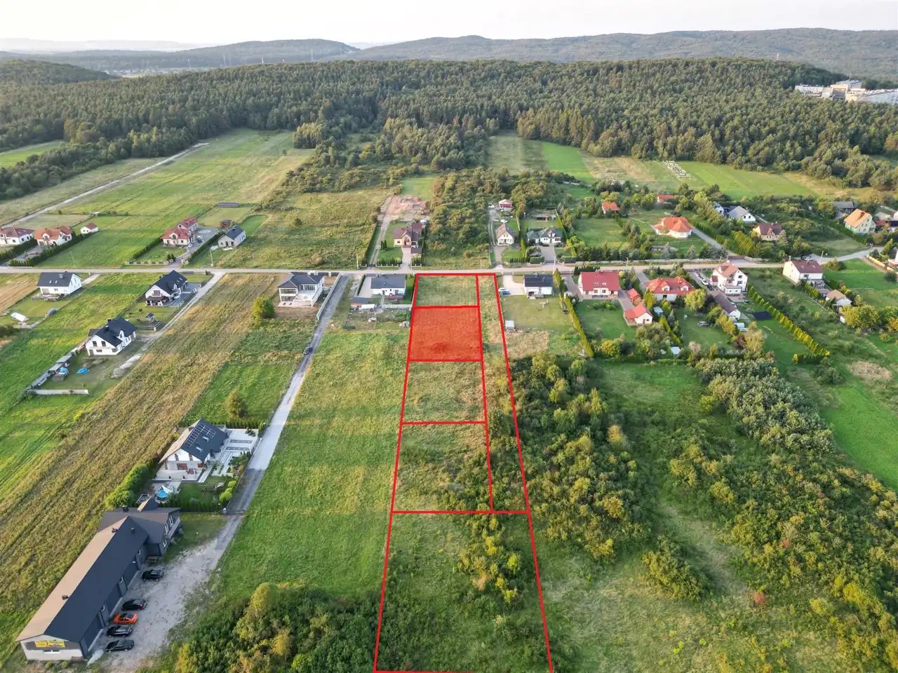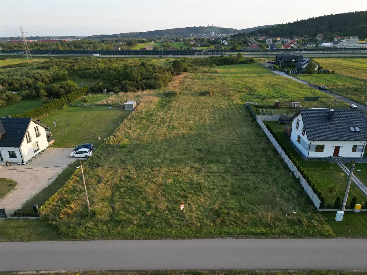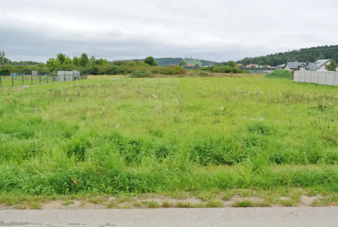 For sale: a plot of land with an area of 1038 m², located in Chęciny. The plot is in the second line from the asphalt road – Sitkówka Street. It is flat, undeveloped, rectangular in shape, and situated among single-family houses.