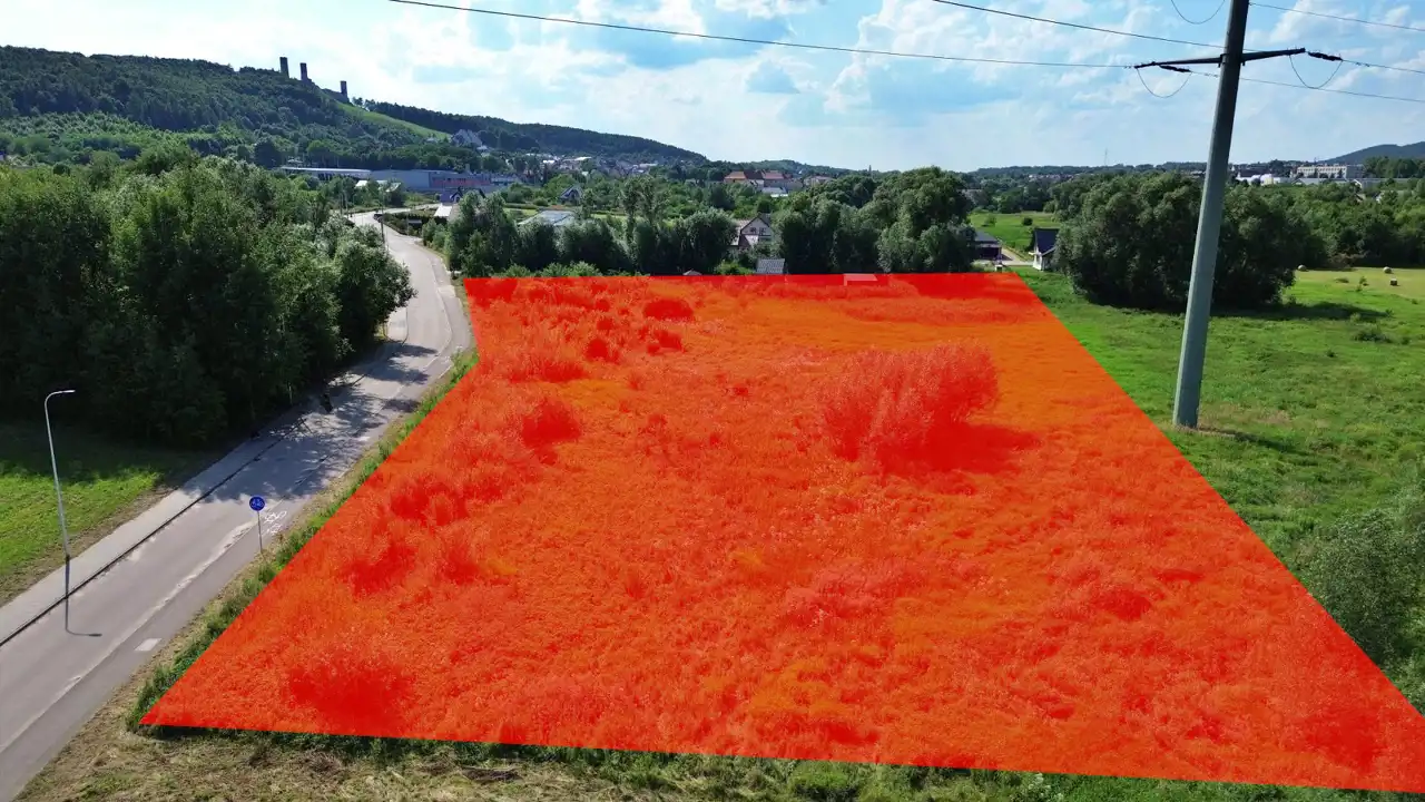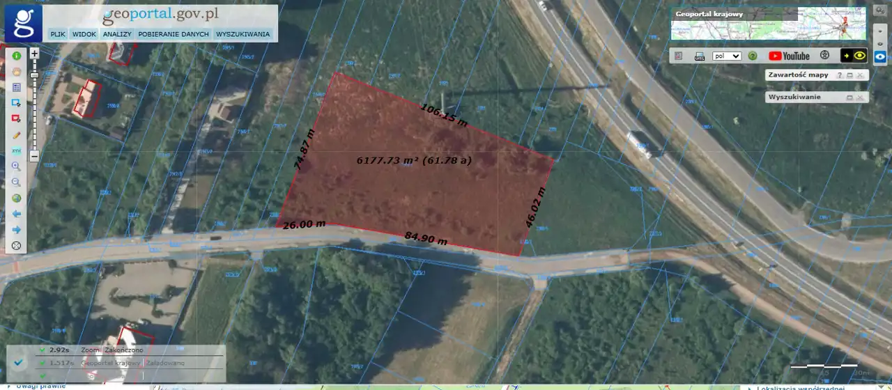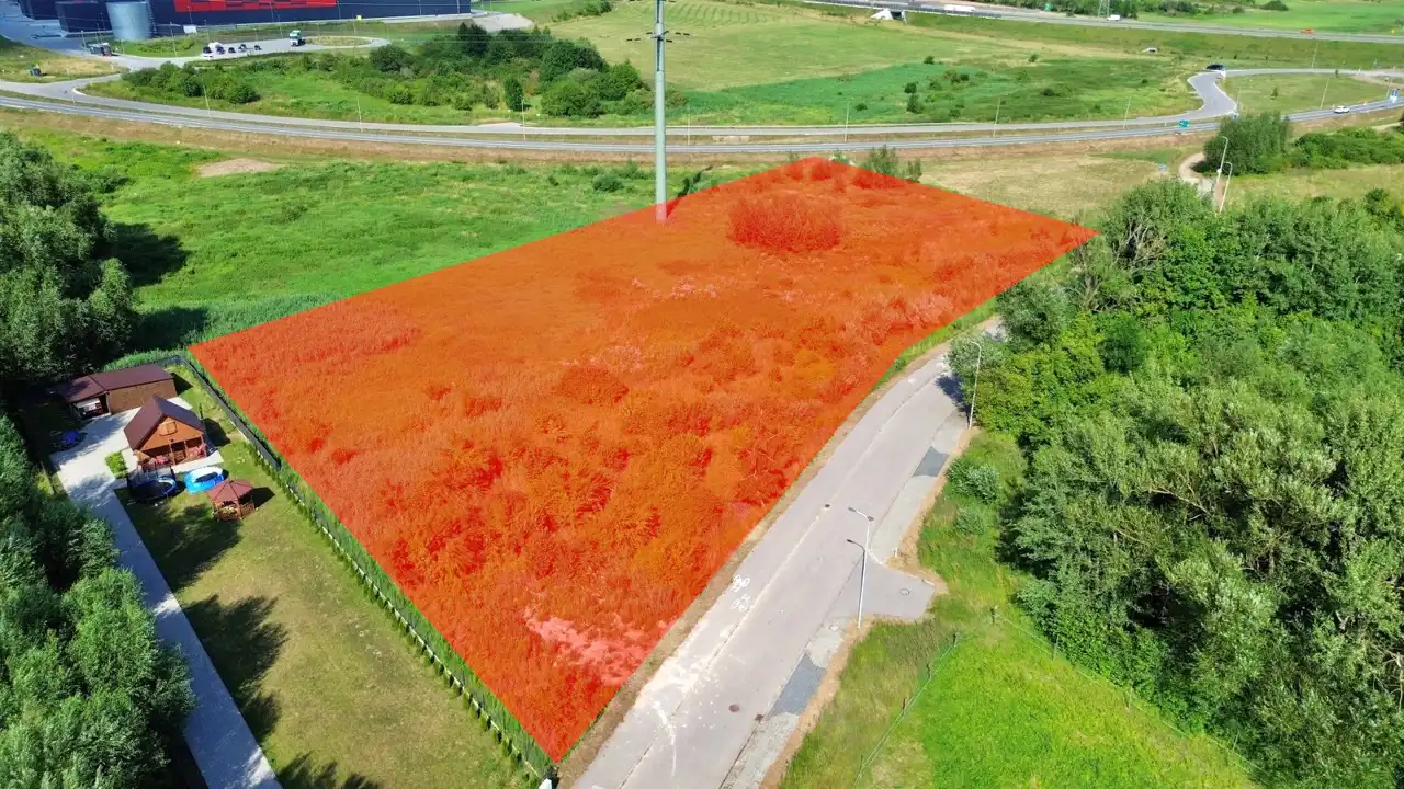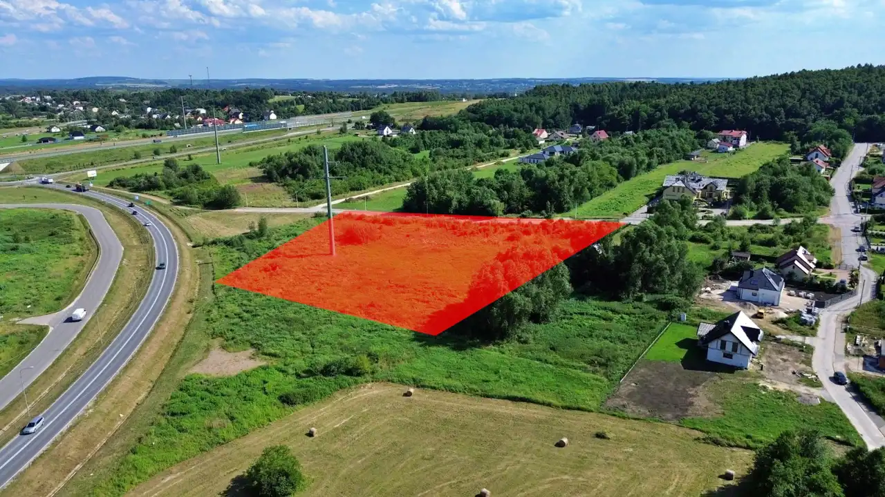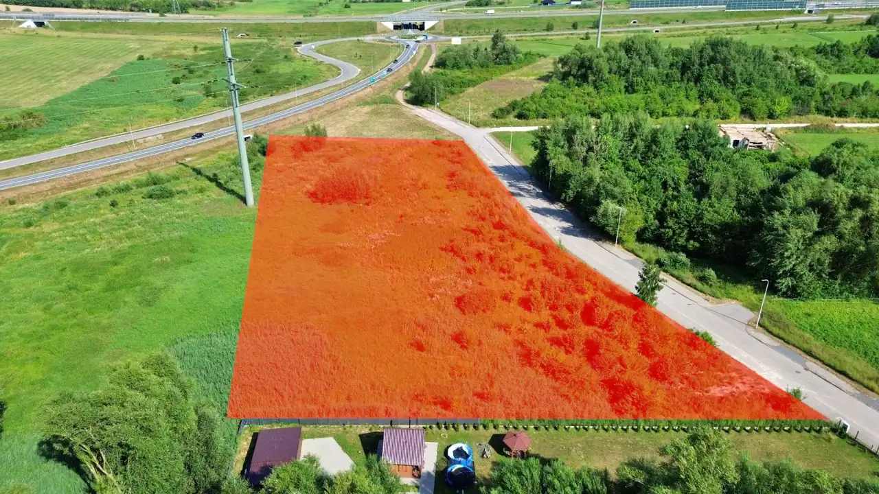 The plot is flat, undeveloped, trapezoidal in shape, and situated directly along the main road. It is surrounded by undeveloped plots and new buildings.