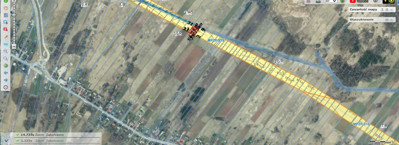 Główna część działki w kształcie zbliżonym do prostokąta o wymiarach ok. 33 x 367 x 33 x 360 [m]. Przednia część działki od drogi asfaltowej stanowi drogę dojazdową. Tylnia część działki na obszarze ok. 1250m2, posiada Miejscowy Plan Zagospodarowania Przestrzennego oznaczona jako trasy linii przesyłowej 220 kV Kielce Piaski – Radkowice wraz z rozbudową stacji Radkowice na obszarze miasta i gminy Chęciny trasy linii przesyłowej 220 kV Kielce Piaski – Radkowice wraz z rozbudową stacji Radkowice na obszarze miasta i gminy Chęciny