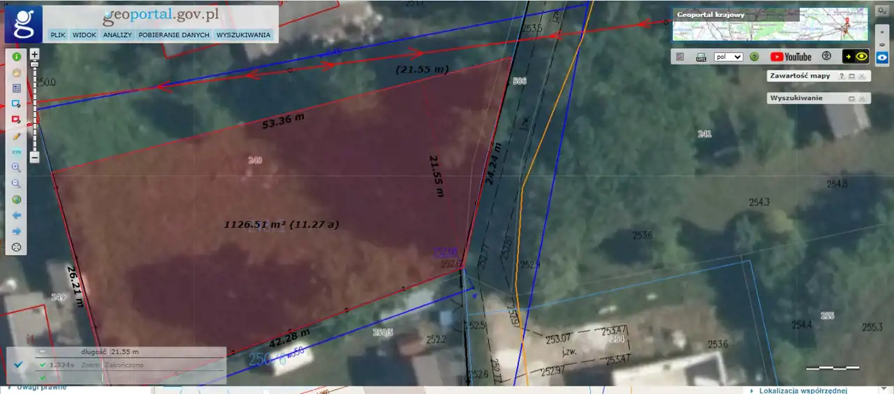 Wymiary działki: ok. 24 (szer. od frontu; 21m pod kątem prosty) x 53 x 26 x 42 [m].