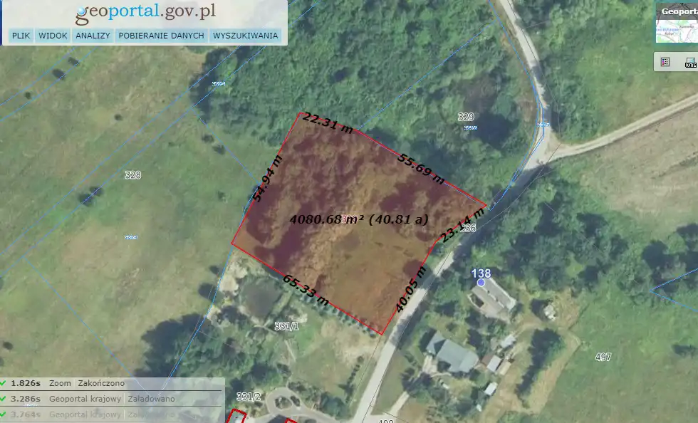 For Sale: Plot of land with an area of 4200 sqm, located in Ostrow, Chęciny commune. The plot is accessible via an asphalt road. It is flat, situated in the first row from the road, unfenced, undeveloped, and has a polygonal shape. There is a water feature (stream) on the plot (the shoreline is being delimited).