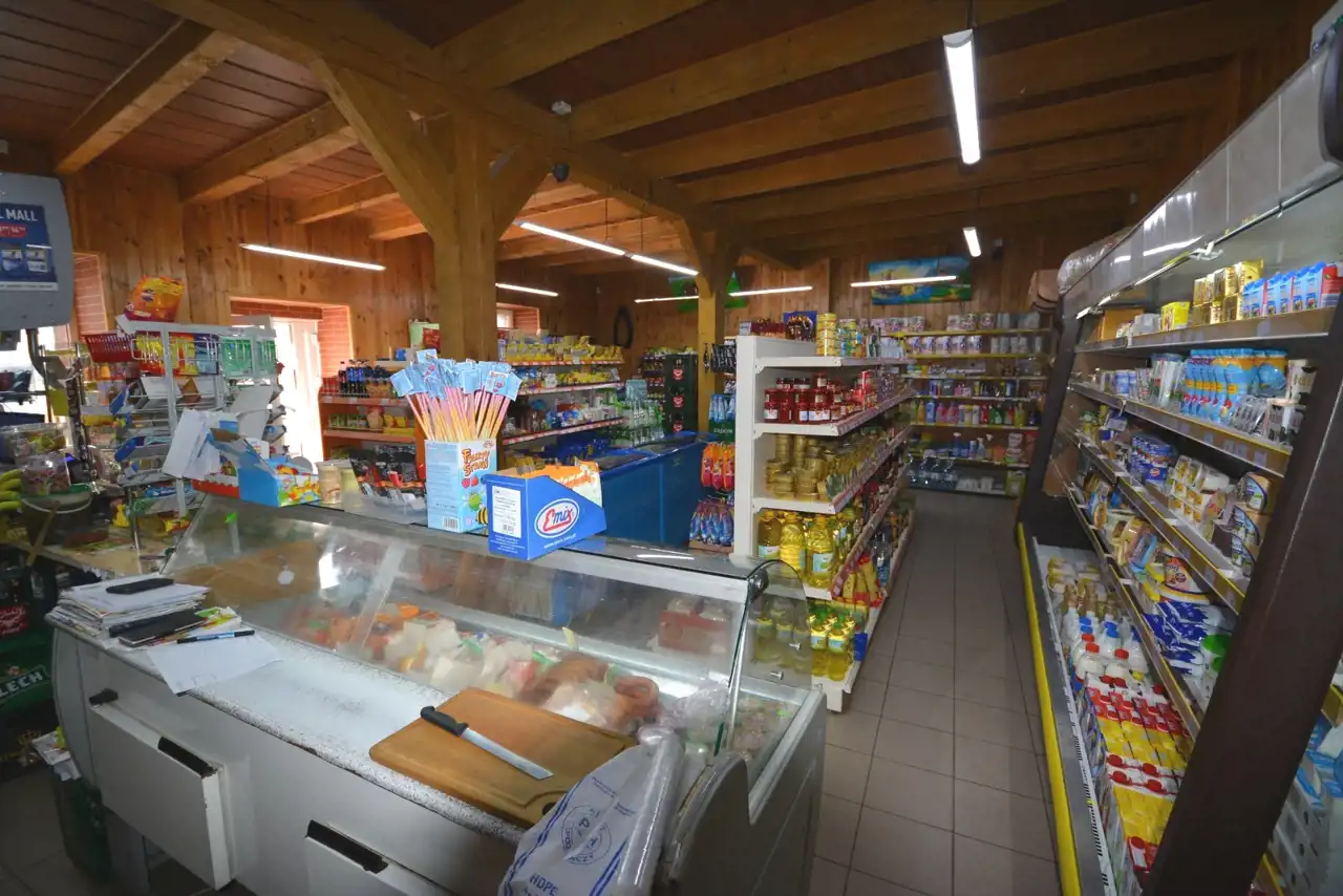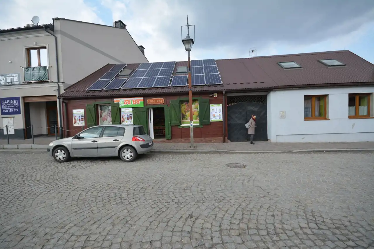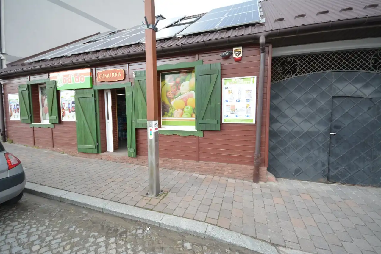 For sale is a commercial-residential property with a total area of approximately 200 sqm (usable area of approximately 180 sqm) located in Chęciny. The plot of land has an area of 161 sqm. The building is a two-story structure with a grocery store on the ground floor and a residential unit on the first floor, with a usable area of approximately 80 sqm (total area of approximately 100 sqm).