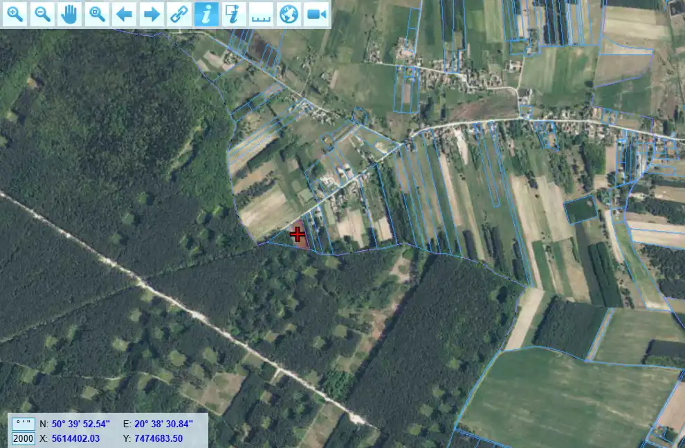 For sale: a 5,428 m² plot located in Grabowiec, Chmielnik Municipality. The undeveloped plot has a trapezoidal shape with approximate dimensions of 50 x 136 x 53 x 93 m. The frontage width is 50 m. Access to the property is via an asphalt road. The surroundings include a forest and a small number of buildings.