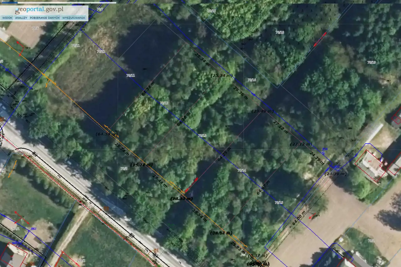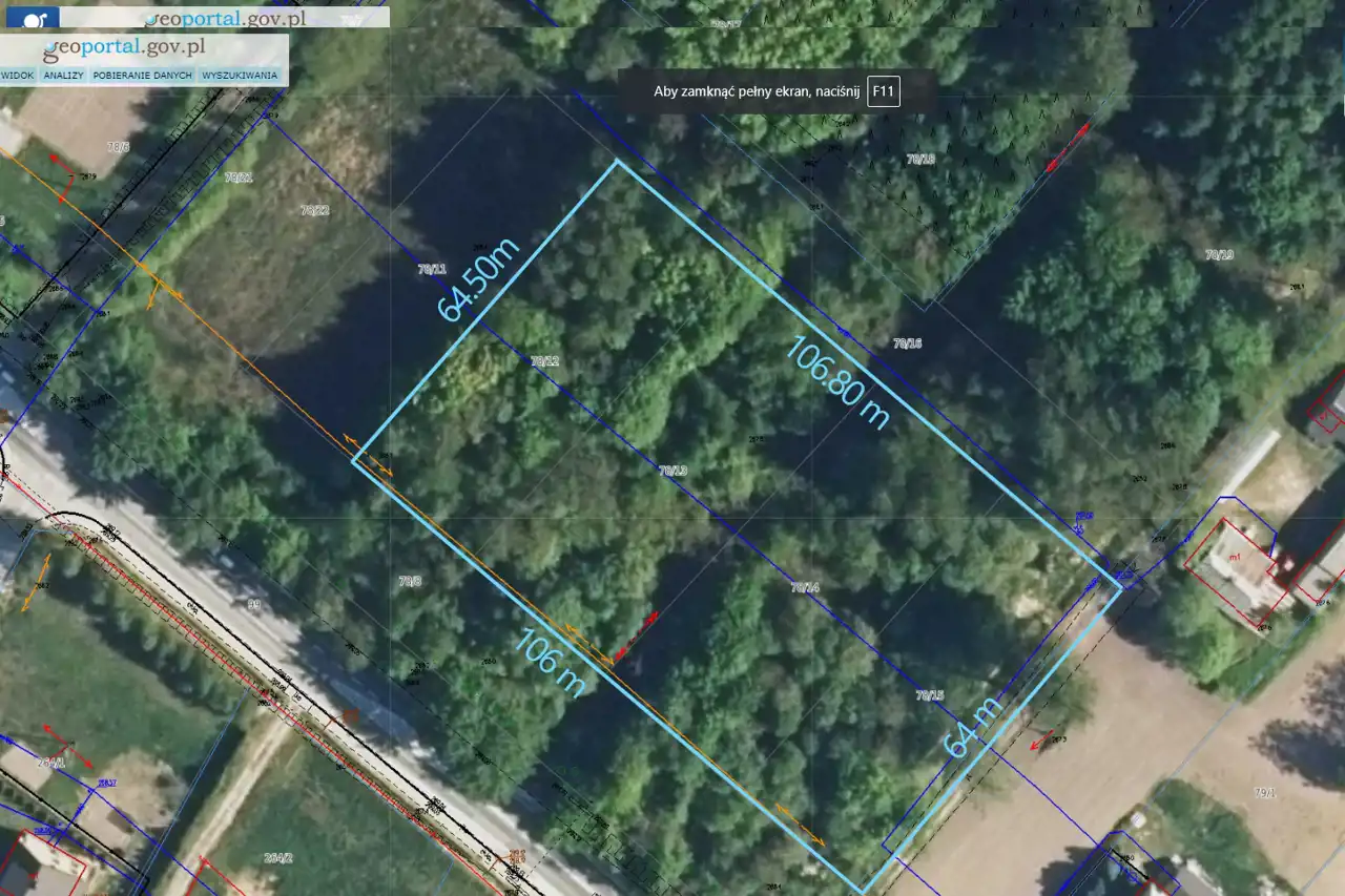 Wymiary działki: ok. 64 x 106 [m]. Front: 64m.