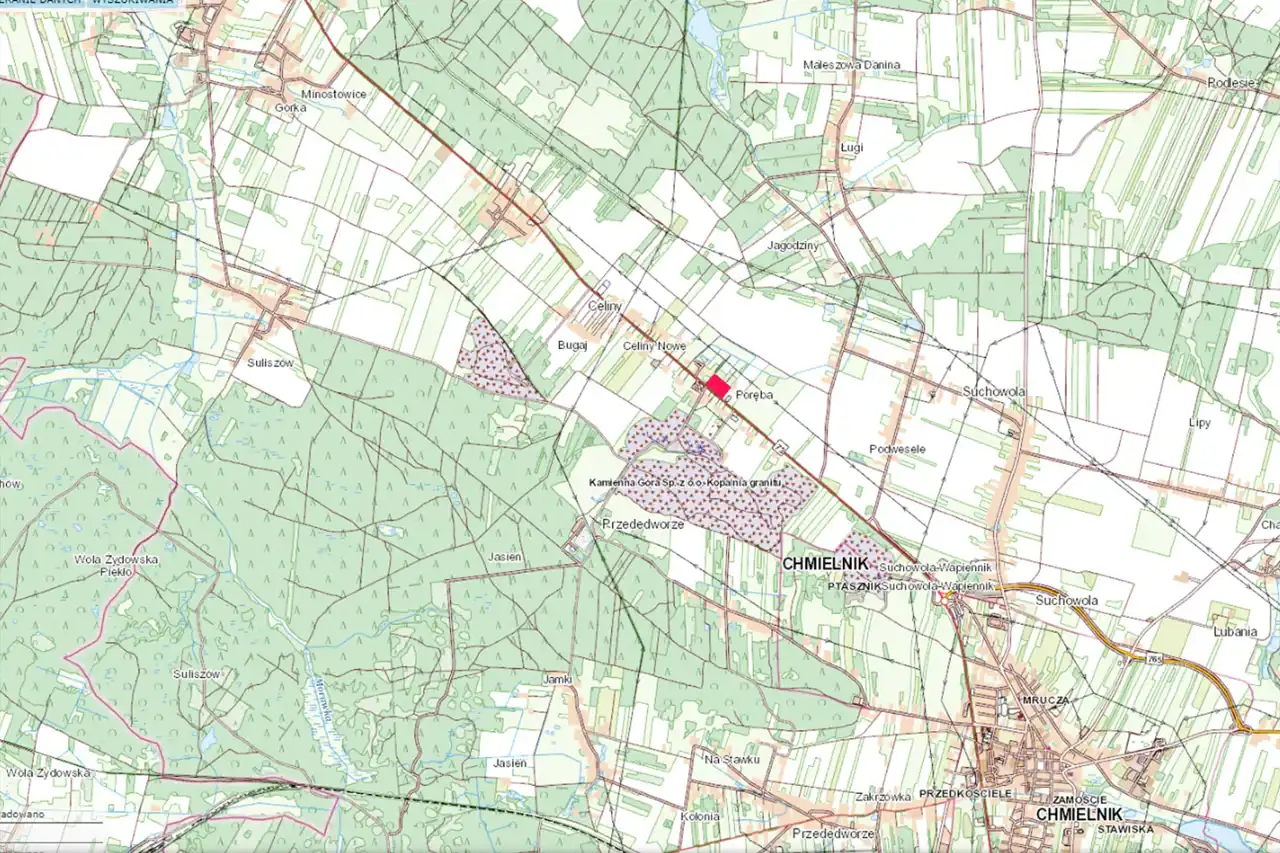 For sale: Plot of land with an area of 7200 sqm, located in the village of Celina, Chmielnik municipality. The plot is situated by the main road, flat, rectangular, and in the front row of the planned municipal road, undeveloped.
