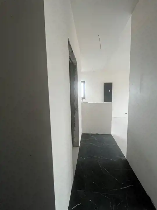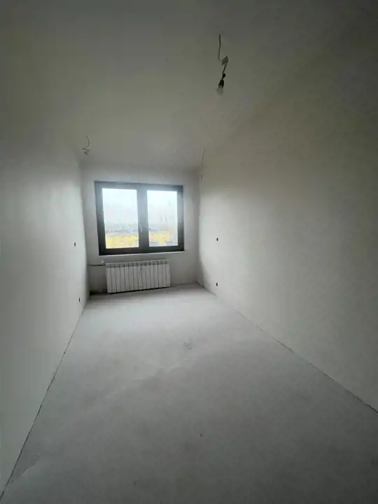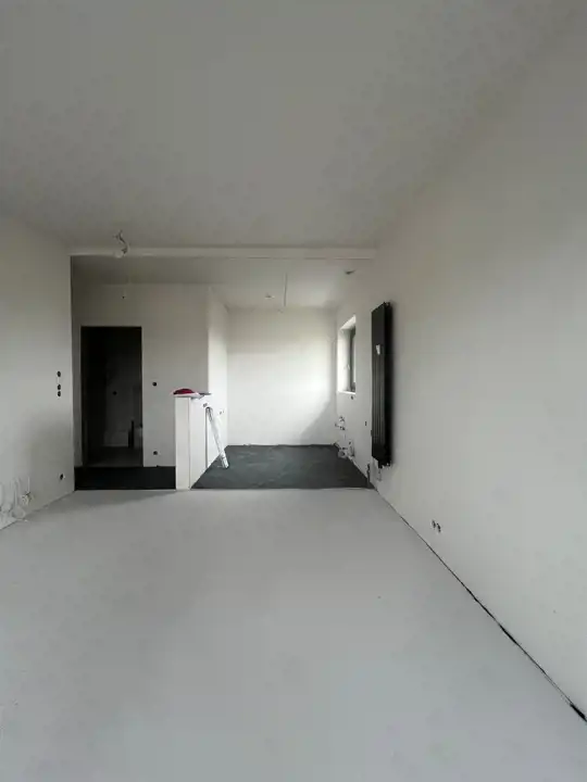 Mieszkanie w stanie częściowo wykończonym z dużymi przeszkleniami, które zapewniają dużo naturalnego światła.