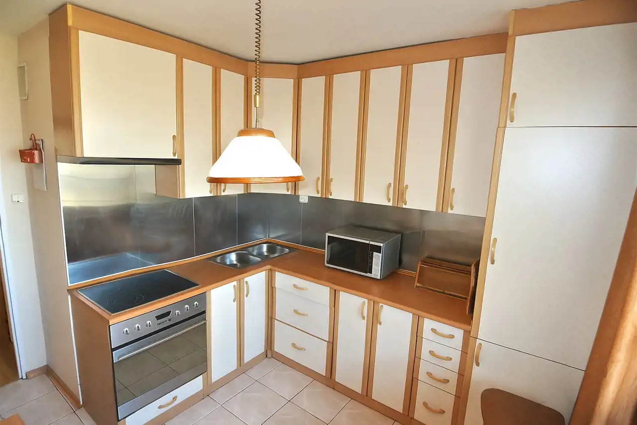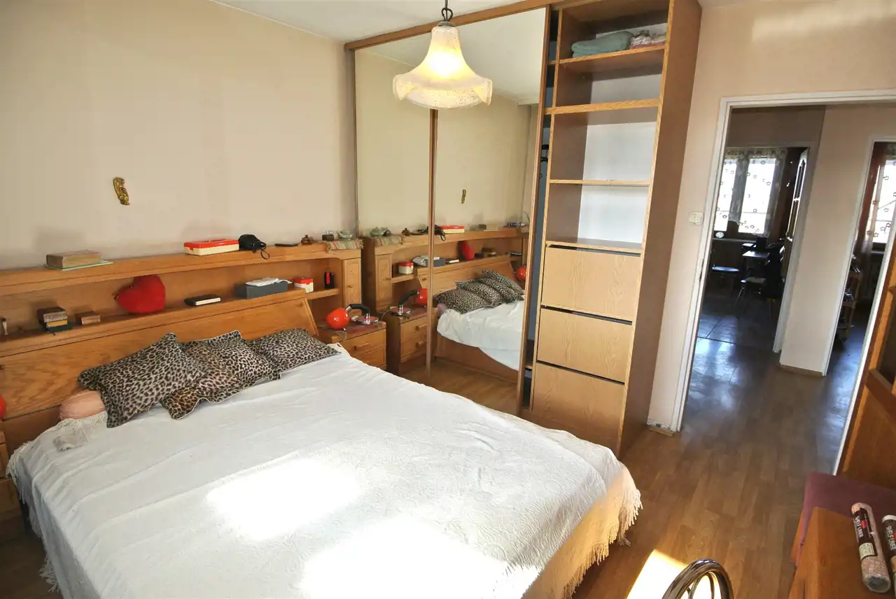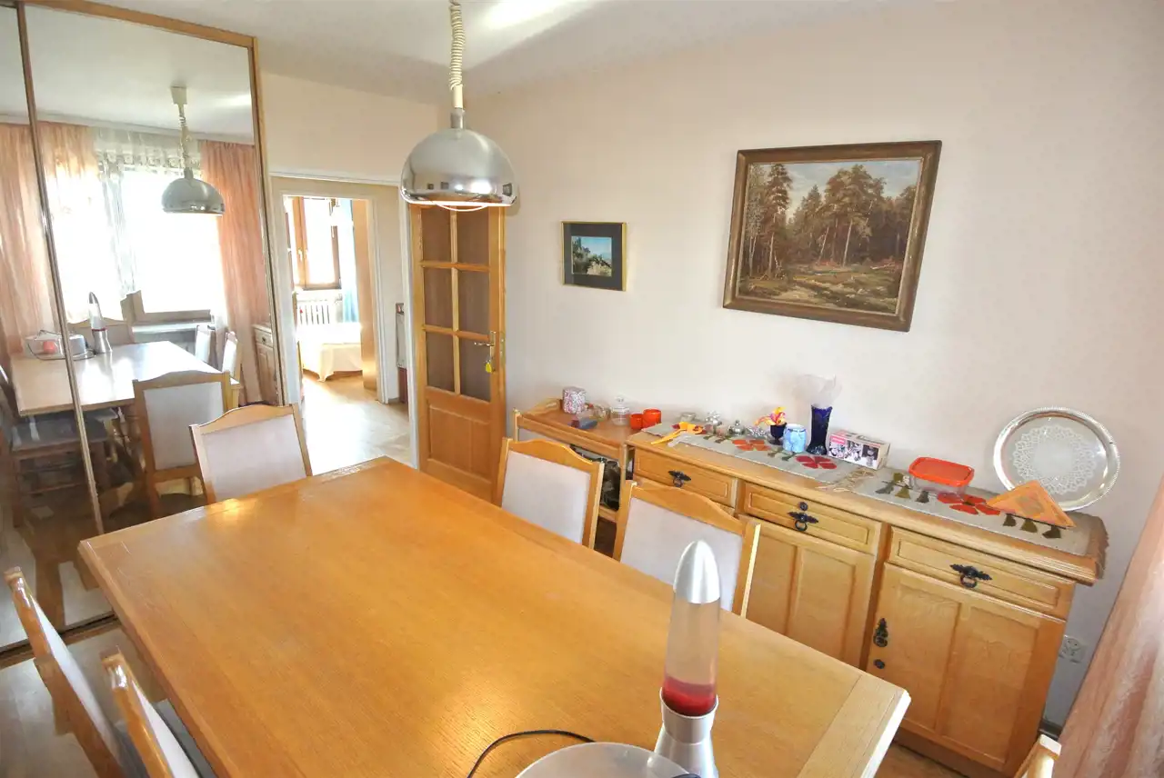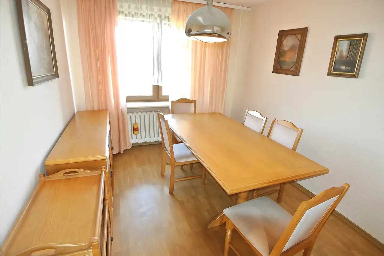 Flooring: panels in the rooms and hallway, tiles in the kitchen and bathroom.