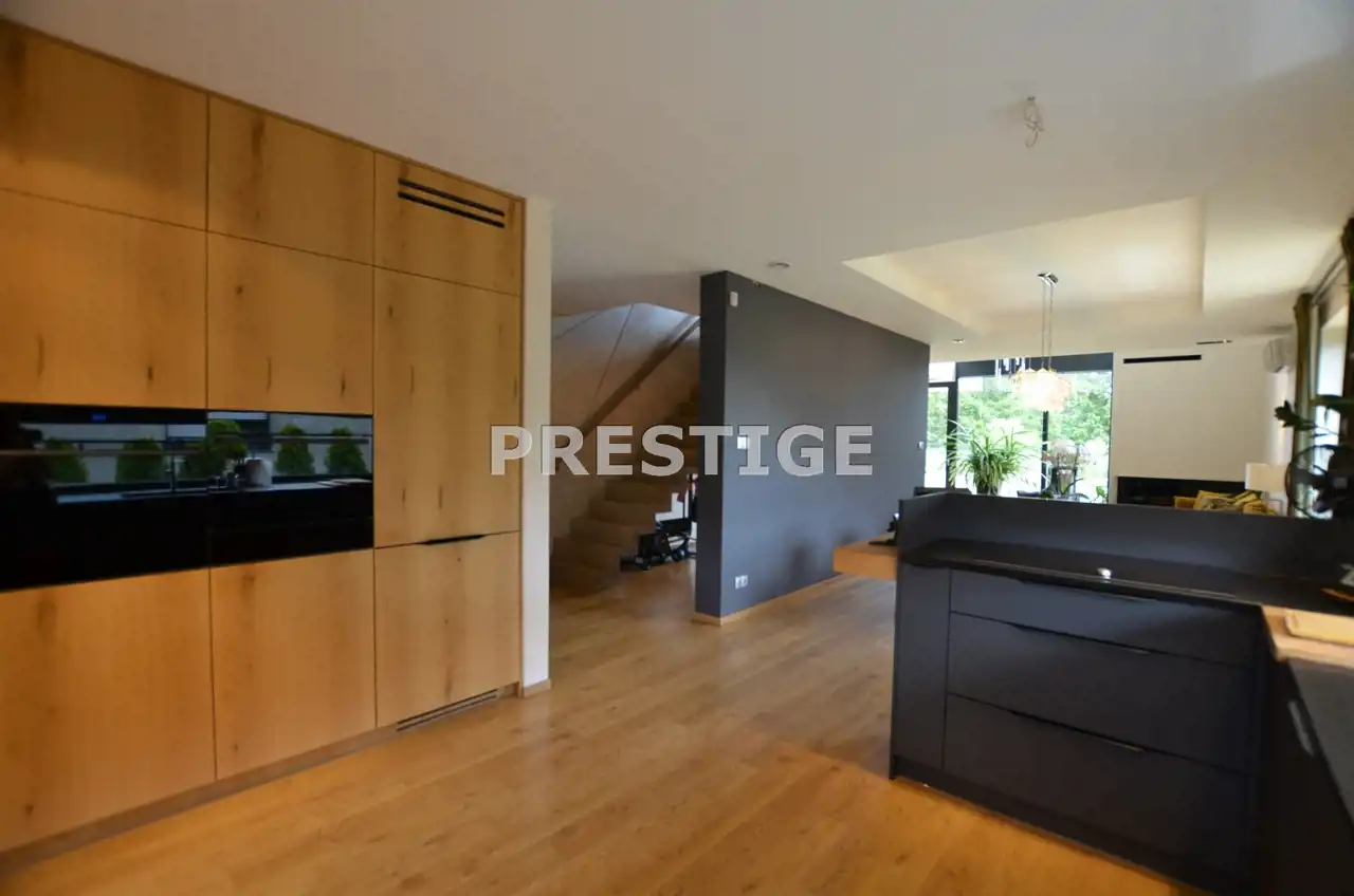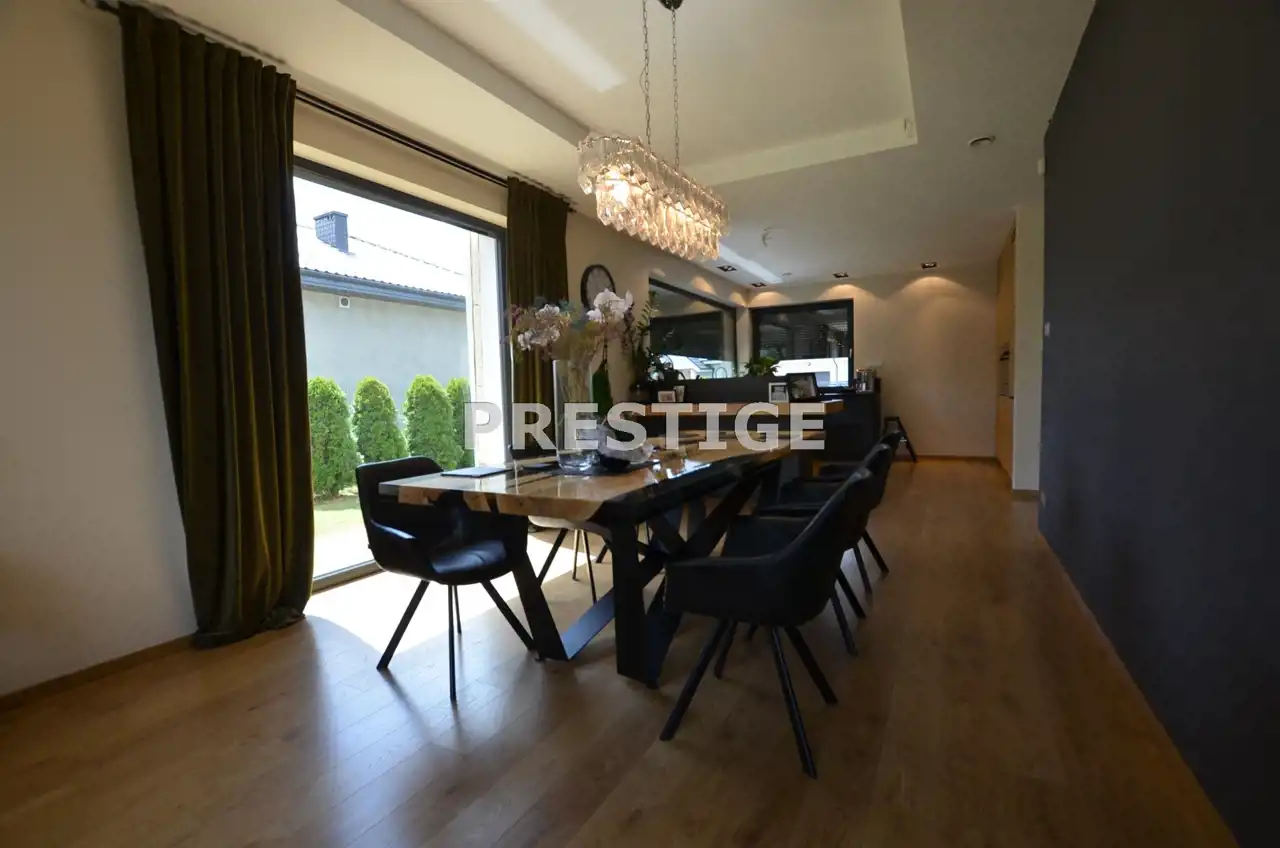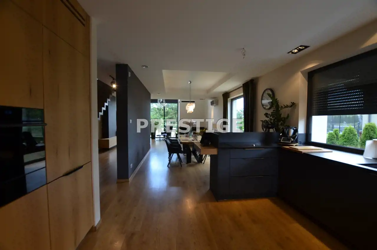 Na poziomie parteru wydzielono przestronną część dzienną stanowiącą otwartą przestrzeń: salonu, kuchni i jadalni. Salon z dużymi przeszkleniami na rekreacyjną, zieloną część ogrodu. Kuchnia zabudowana na wymiar, blaty granitowe, meble i sprzęt AGD wysokiej jakości. Jadalnia w której wygodnie pomieści się duża rodzina przy jednym stole.