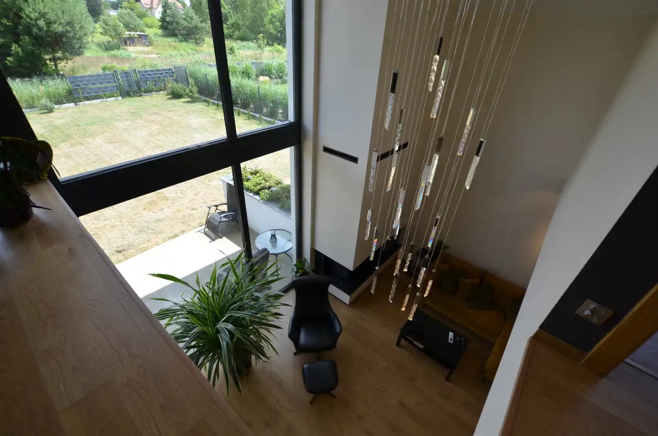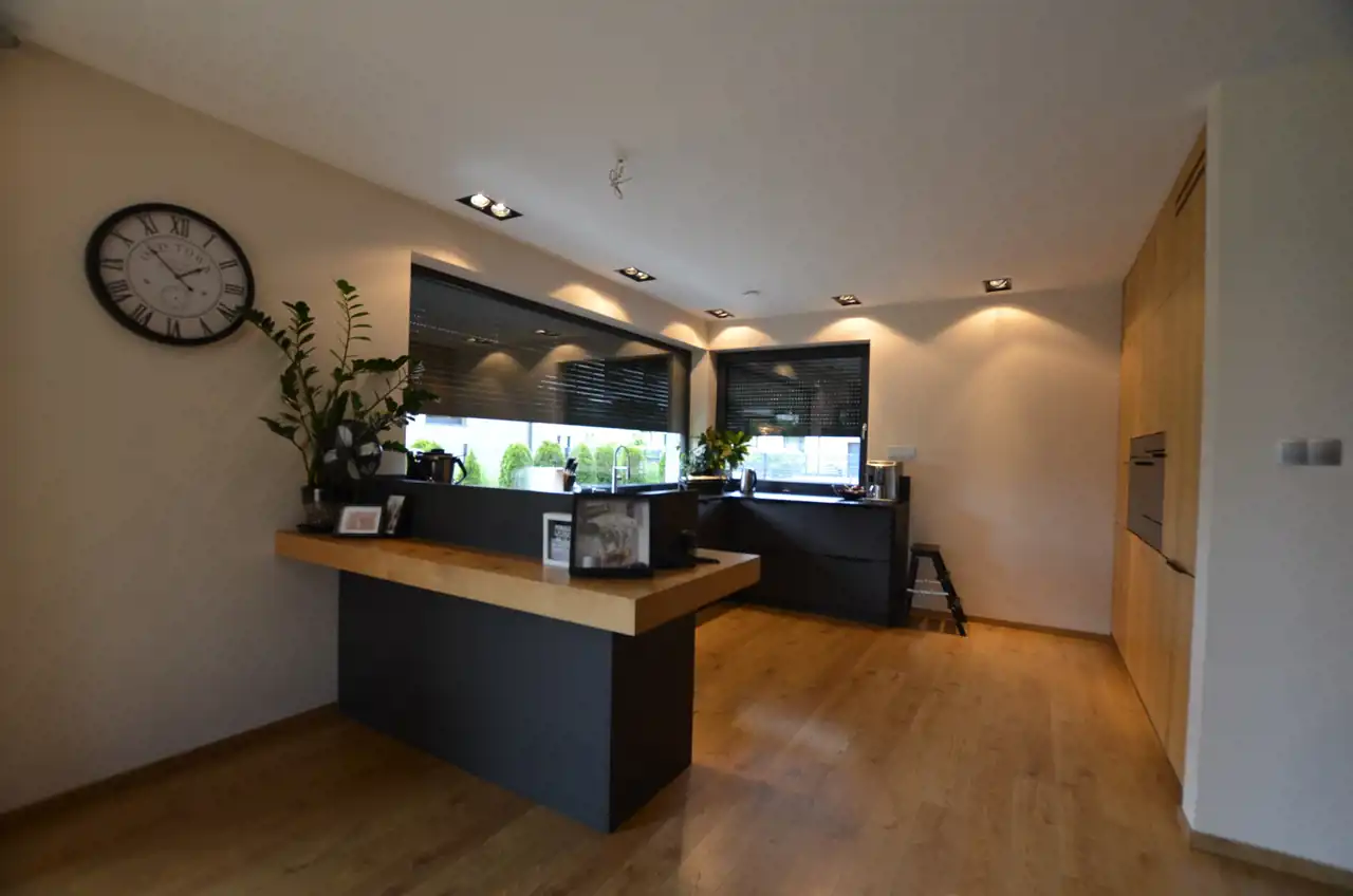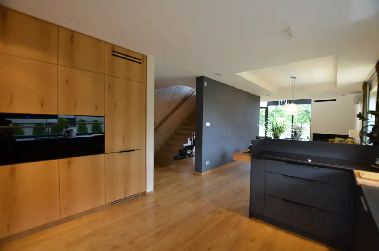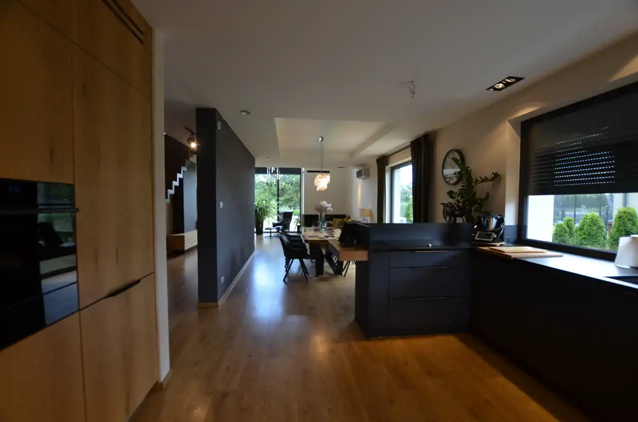 Na poziomie parteru wydzielono przestronną część dzienną stanowiącą otwartą przestrzeń: salonu, kuchni i jadalni. Salon z dużymi przeszkleniami na rekreacyjną, zieloną część ogrodu. Kuchnia zabudowana na wymiar, blaty granitowe, meble i sprzęt AGD wysokiej jakości. Jadalnia w której wygodnie pomieści się duża rodzina przy jednym stole.