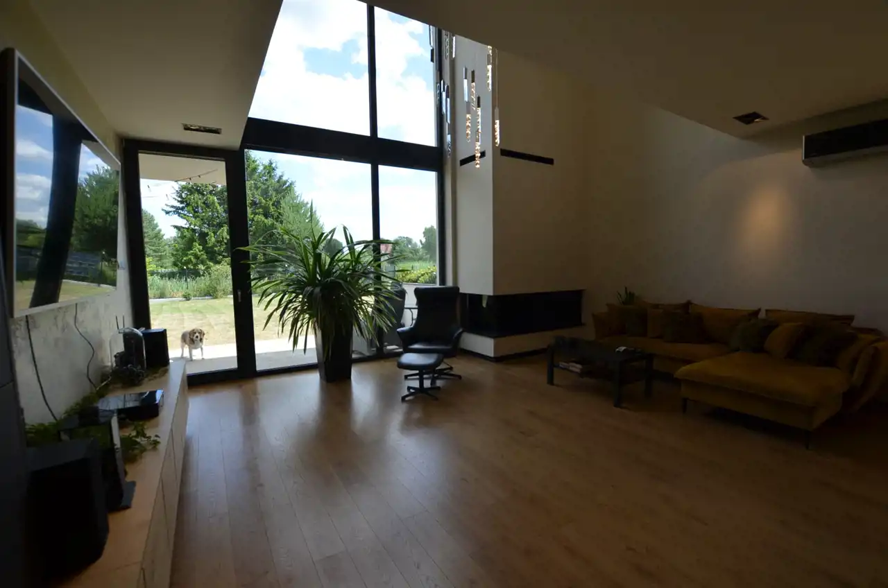 Ogrzewanie podłogowe za pomocą dwufunkcyjnego pieca gazowego, dodatkową funkcję grzewczą jak i ozdobę w salonie stanowi nowoczesny kominek. Dom klimatyzowany, zastosowano rekuperację.