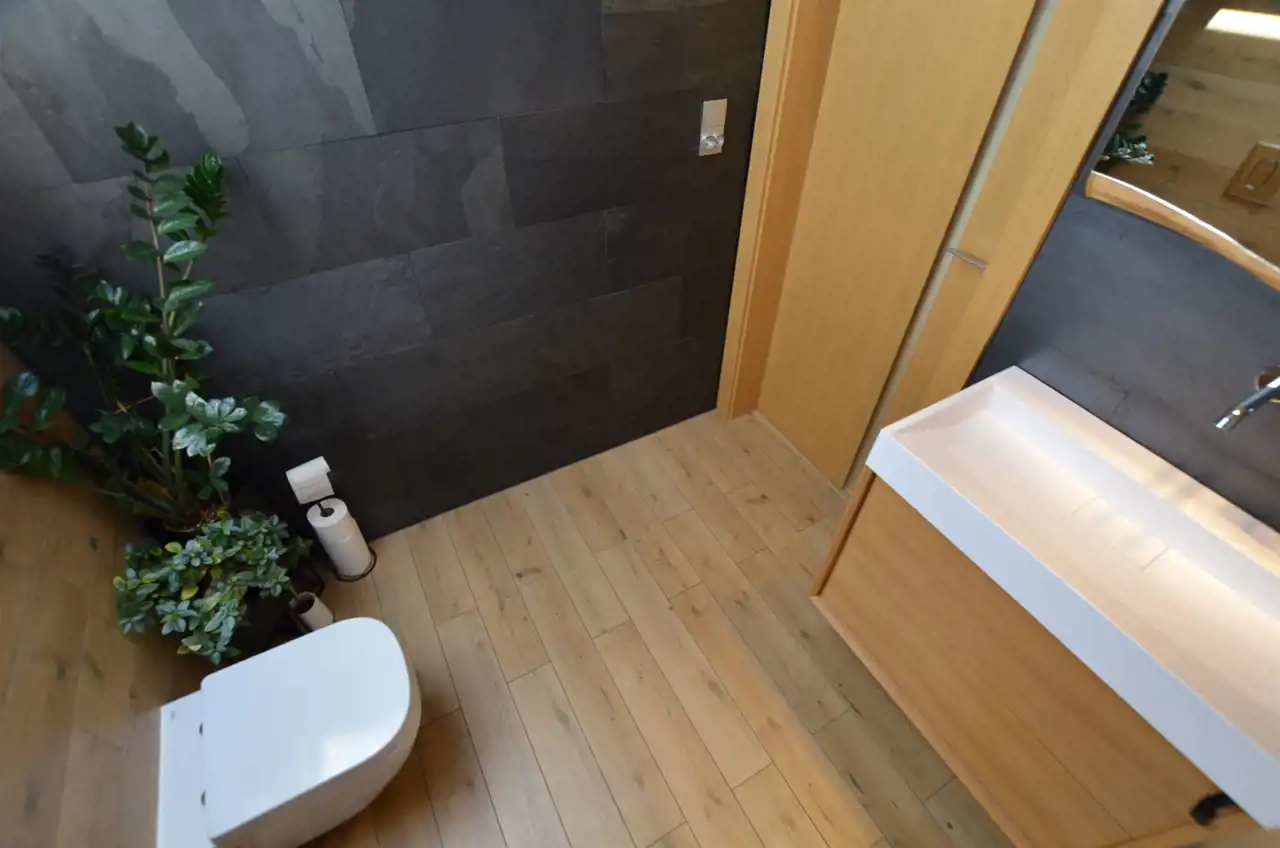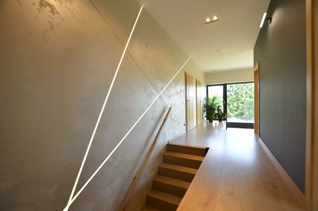 Zgrabna, nowoczesna bryła budynku z dwustanowiskowym garażem, bardzo ładnie prezentuje się z zewnątrz jak i zachwyca wystrojem wnętrza.