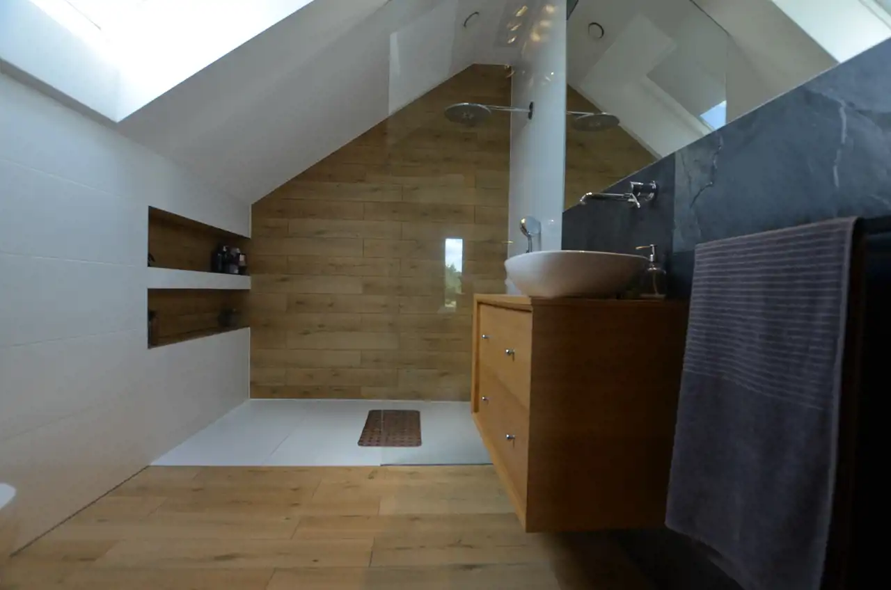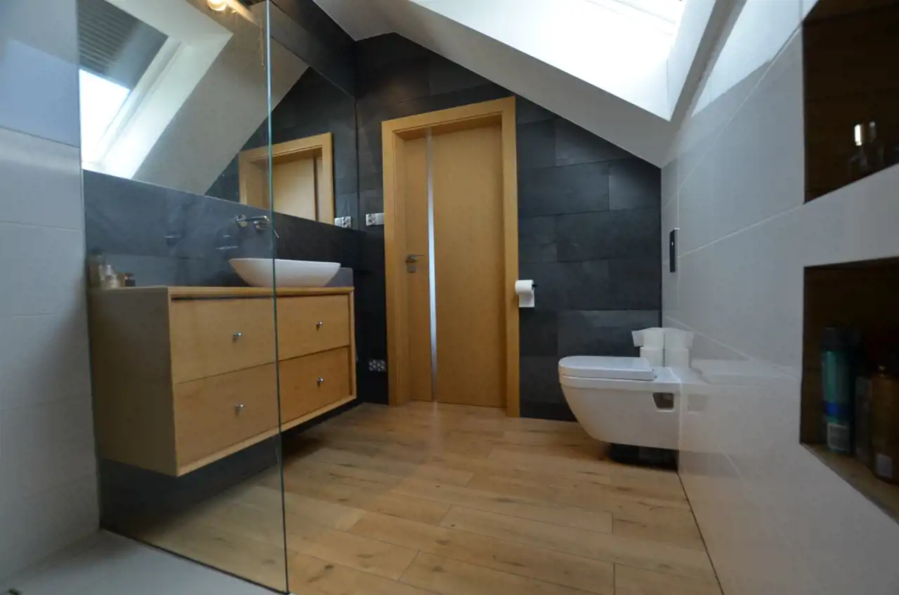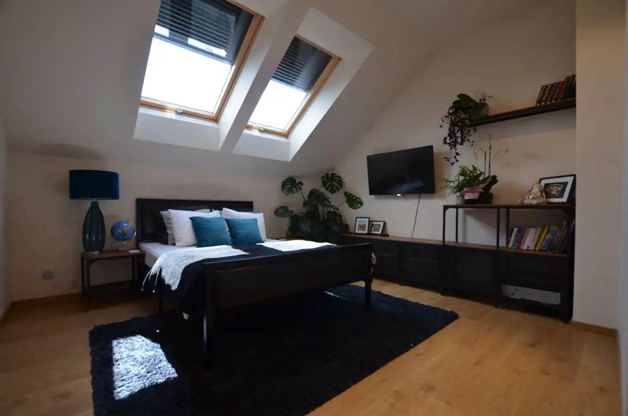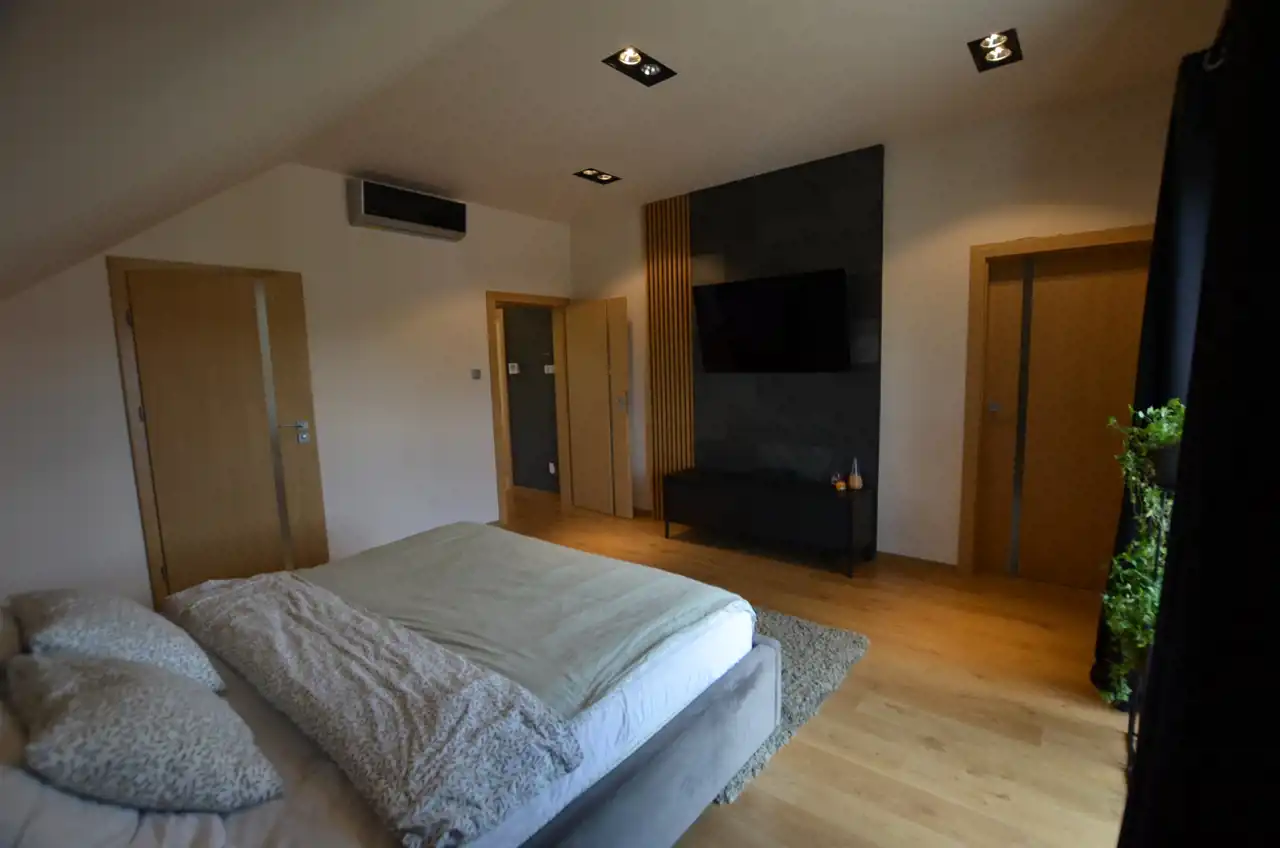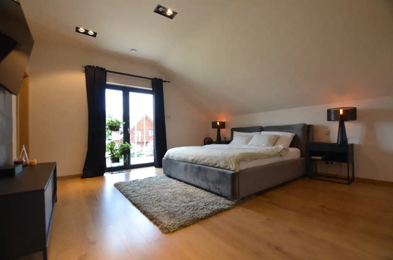 Na poddasze prowadzą piękne schody. Na tym poziomie rozmieszczono 3 sypialnię, w tym sypialnia główna z garderobą i prywatną łazienką. Dodatkowo rodzinną łazienkę i pralnię.