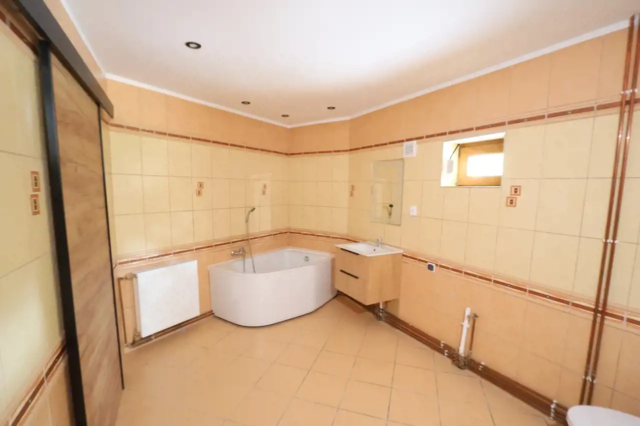 Na parterze nieruchomości znajduje się duży salon, funkcjonalna, przestronna kuchnia oraz sporej wielkości pokój kąpielowy z pomieszczeniem gospodarczym.