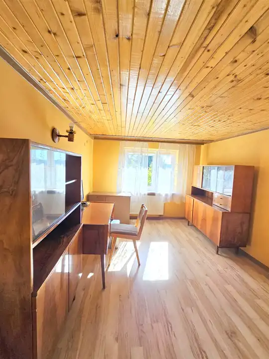 Na parterze znajdują się dwa pokoje, widna kuchnia, obszerna łazienka z toaletą, sień oraz ganek.