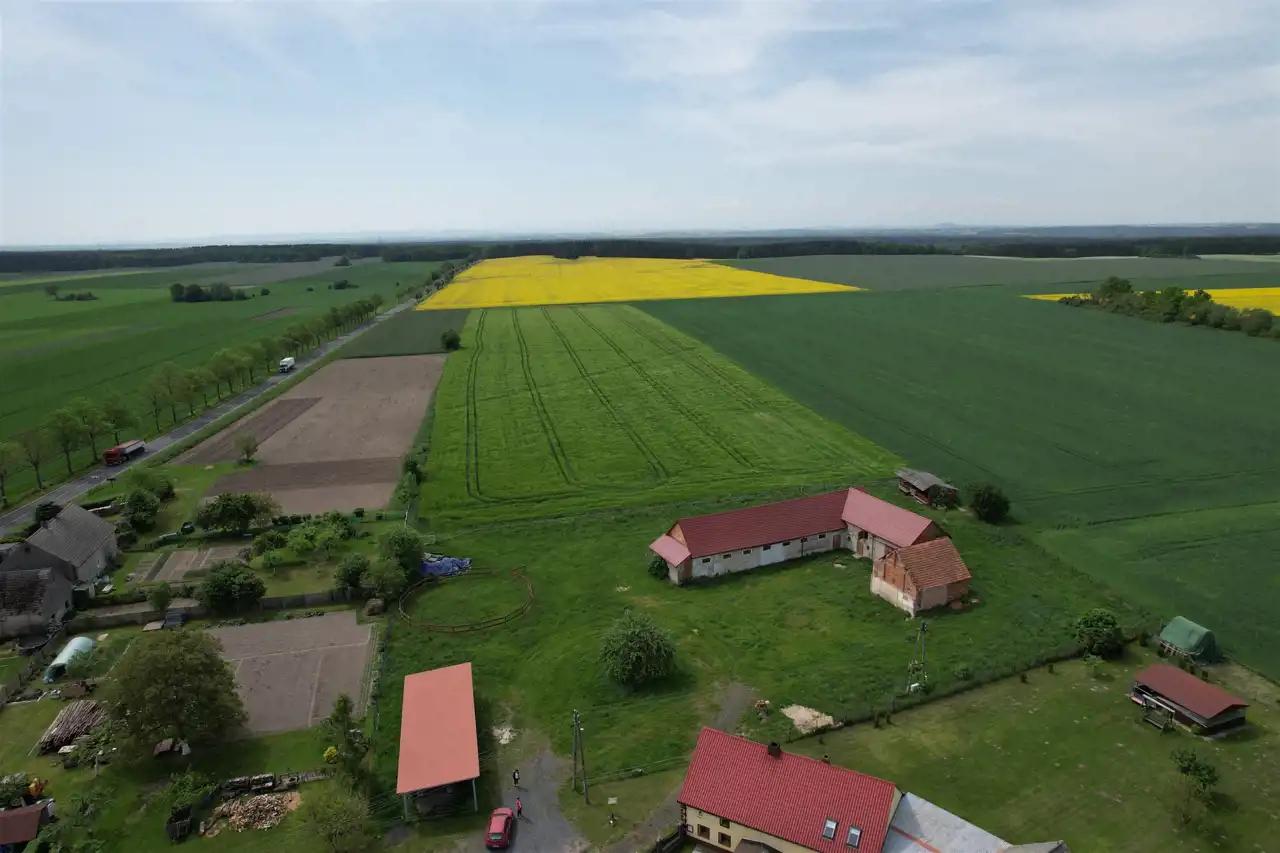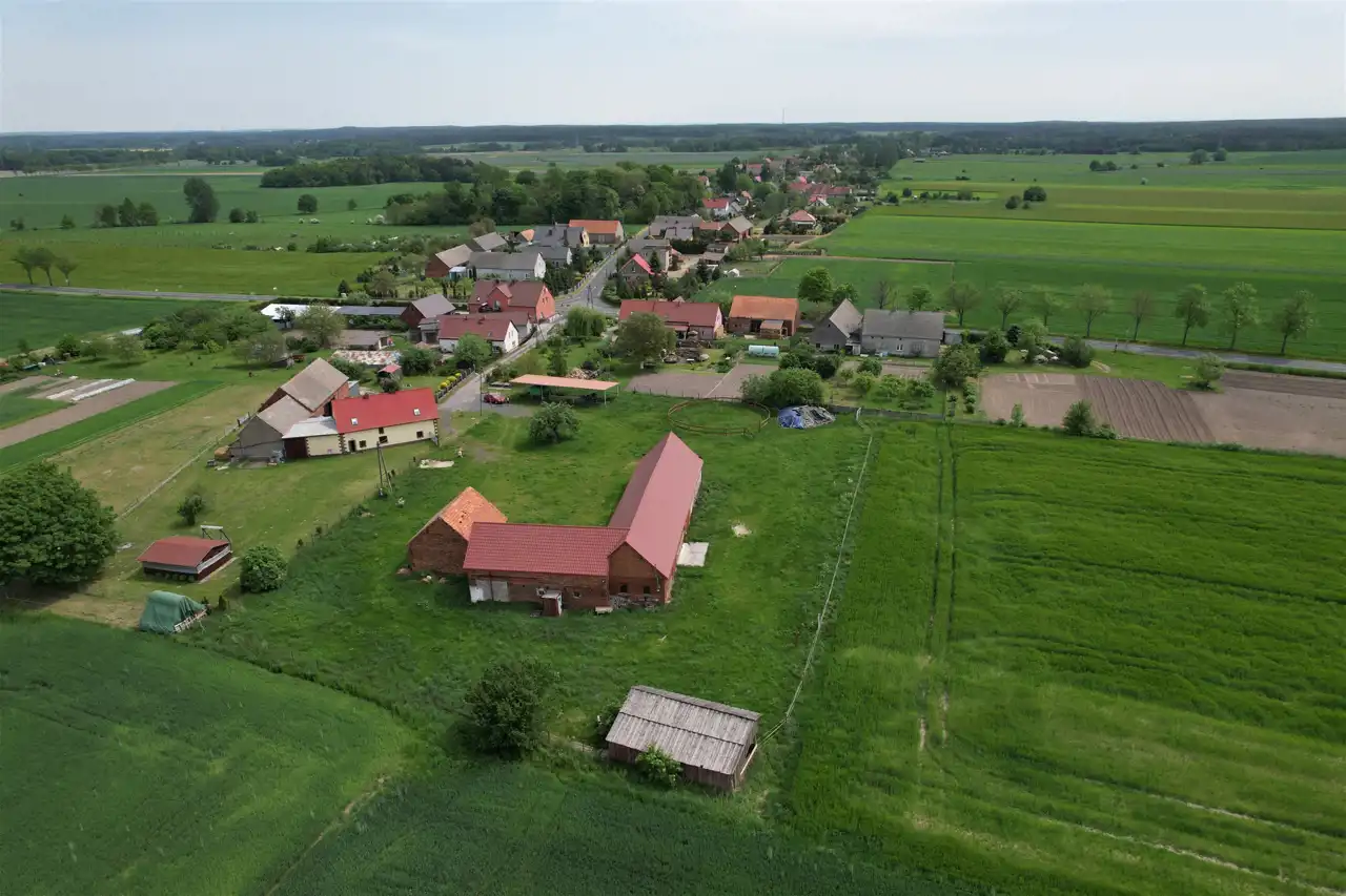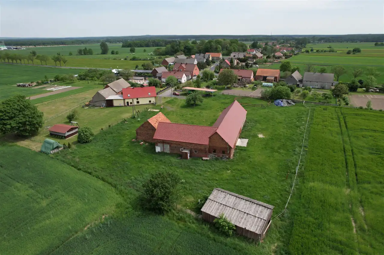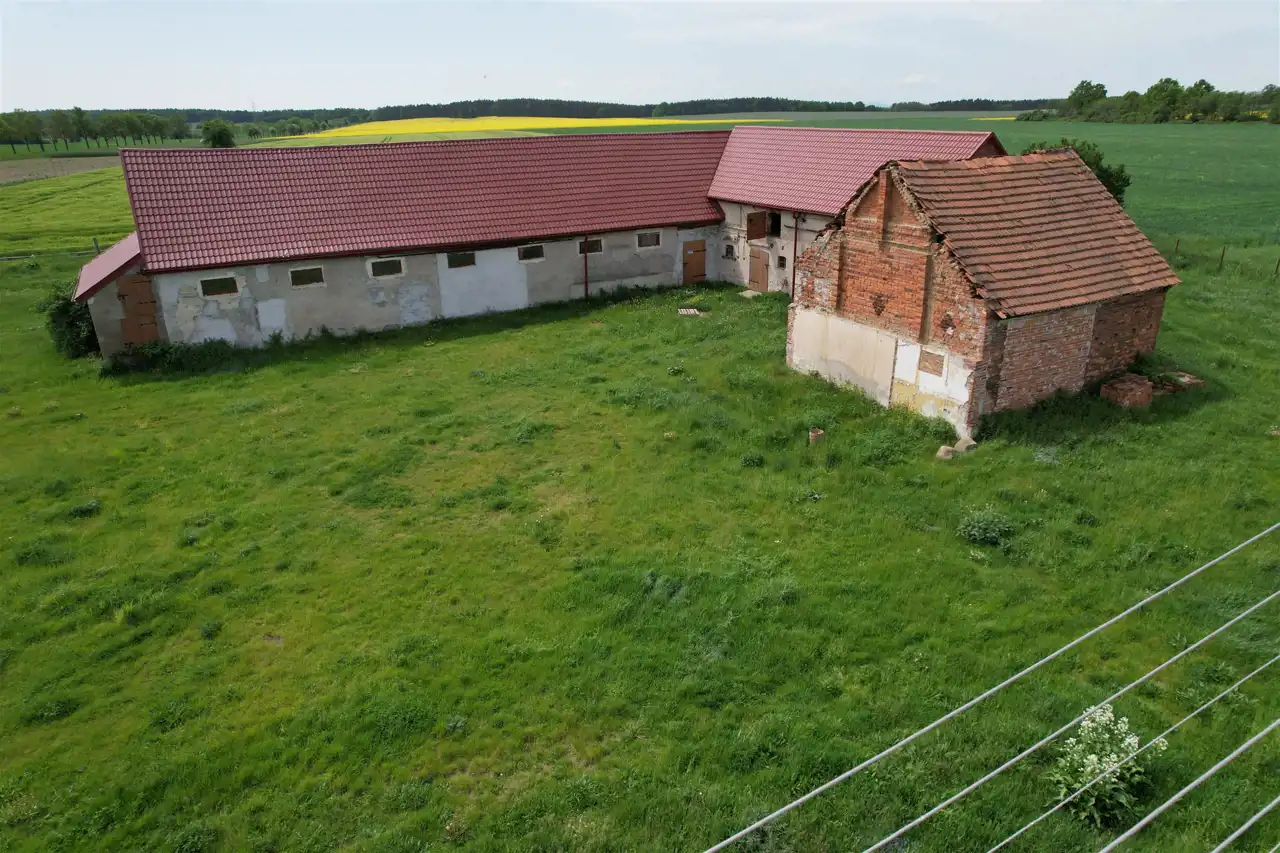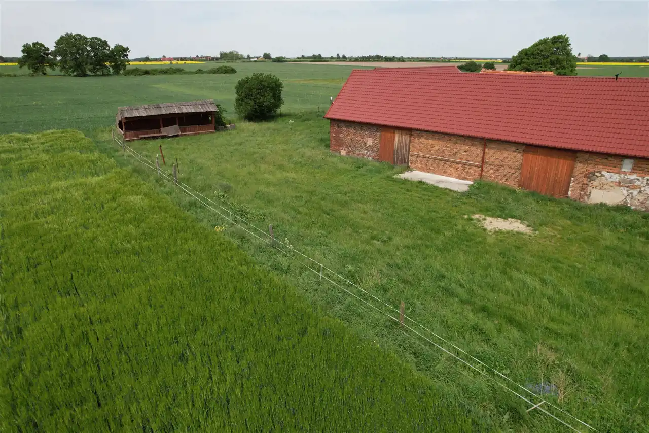 -3 murowane budynki gospodarcze - w tym dwie stajnie z boksami dla koni ( 100 m2 - 4 boksy i 64 m2 - 3 boksy) oraz budynek o pow. 223 m2 posiadający dwie duże bramy wjazdowe .