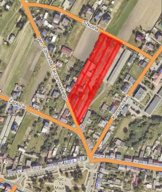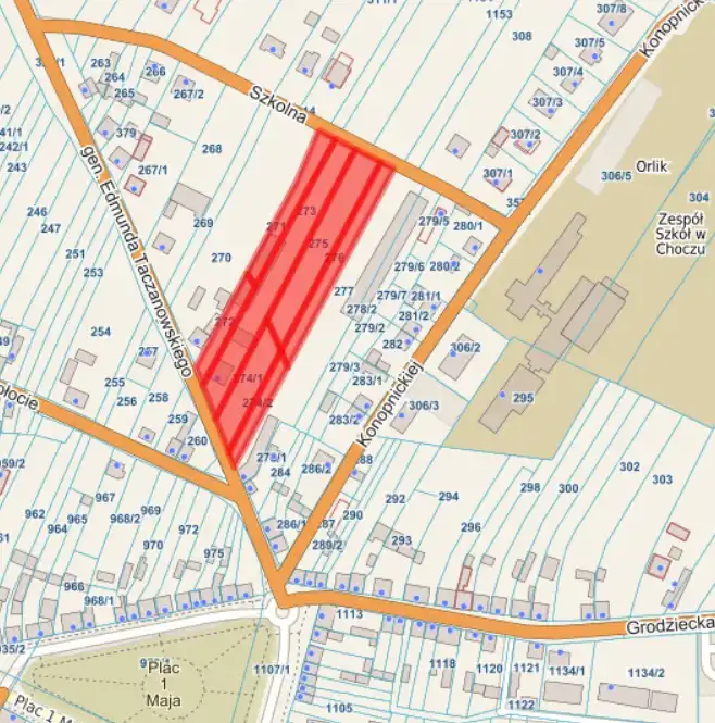 - działek nr 273, 271, 272, 275, 274/1, 276, 274/2 o łącznej powierzchni 0,8300 ha położonej pod adresem: 63-313 CHOCZ. Działki usytuowane są obok siebie i tworzą jeden kompleks obszarowy o kształcie zbliżonym do prostokąta o prostych granicach.