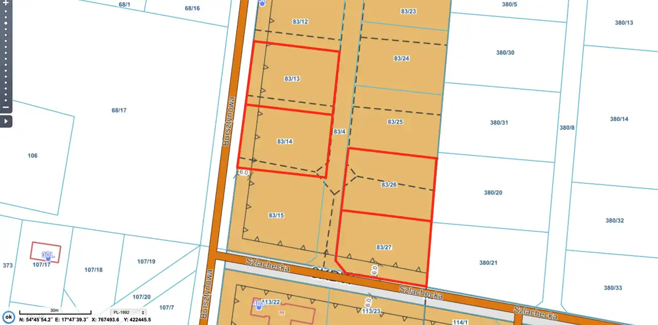 - dz.ew. nr 83/26 o powierzchni 1055 m2 w cenie 225zł/m2