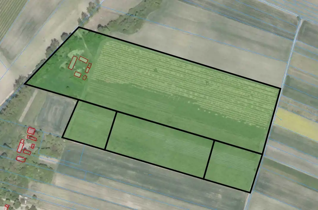 - Teren o zróżnicowanym poziomie. Część zachodnia działki stanowi siedlisko oraz grunt w części zadrzewiony z rowem, pozostała część wykorzystywana w sposób rolniczy z uprawą wieloletnią (malina w wieku około 5 lat odmiana polana uprawiana w sposób ekologiczny).