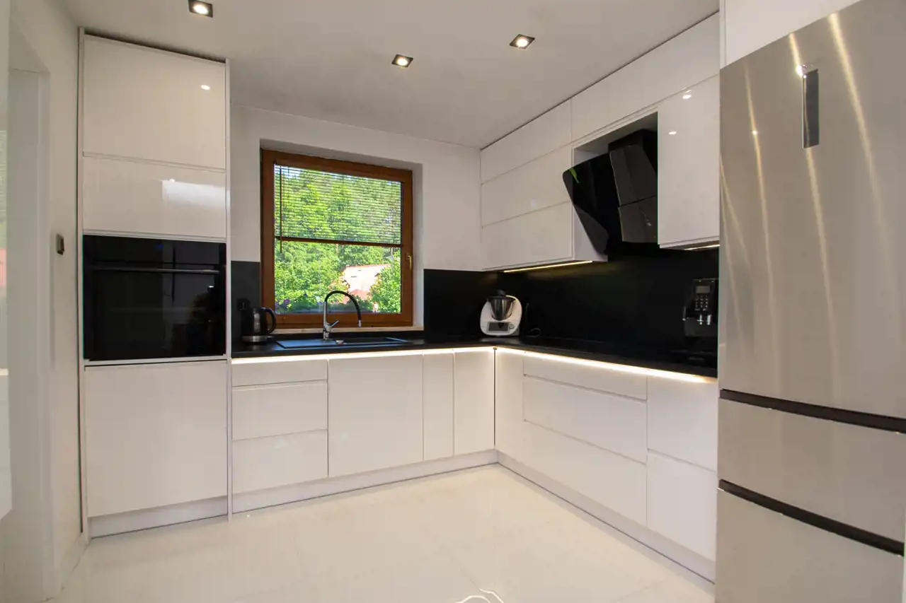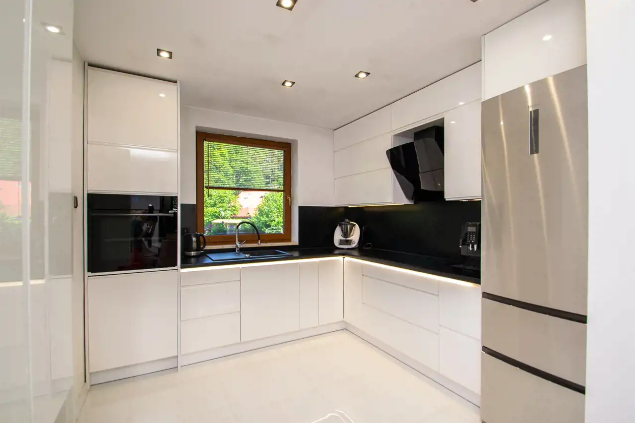 W kuchni zabudowa kuchenna wraz ze sprzętami AGD: piekarnik firmy Samsung, płyta indukcyjna Amica, zmywarka Indesit (60cm), lodówka Haier, ekspres do kawy DeLonghi.