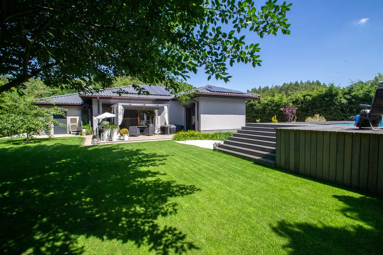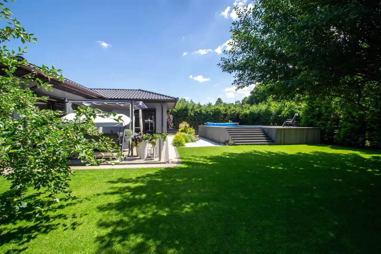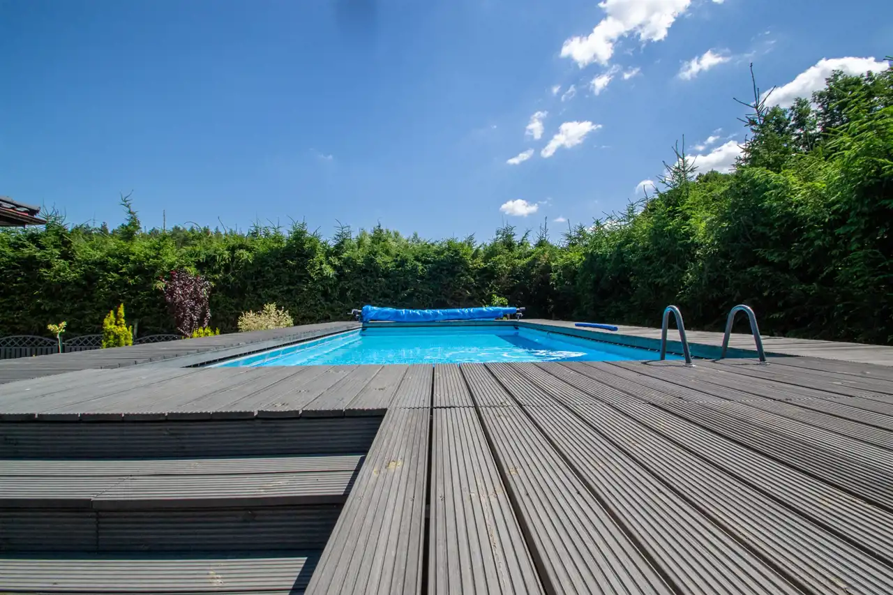 W tylnej części ogrodu basen o wymiarach 9,75m x 4,95m, głębokość: 1,35m. Woda podgrzewana za pomocą indywidualnej pompy ciepła.