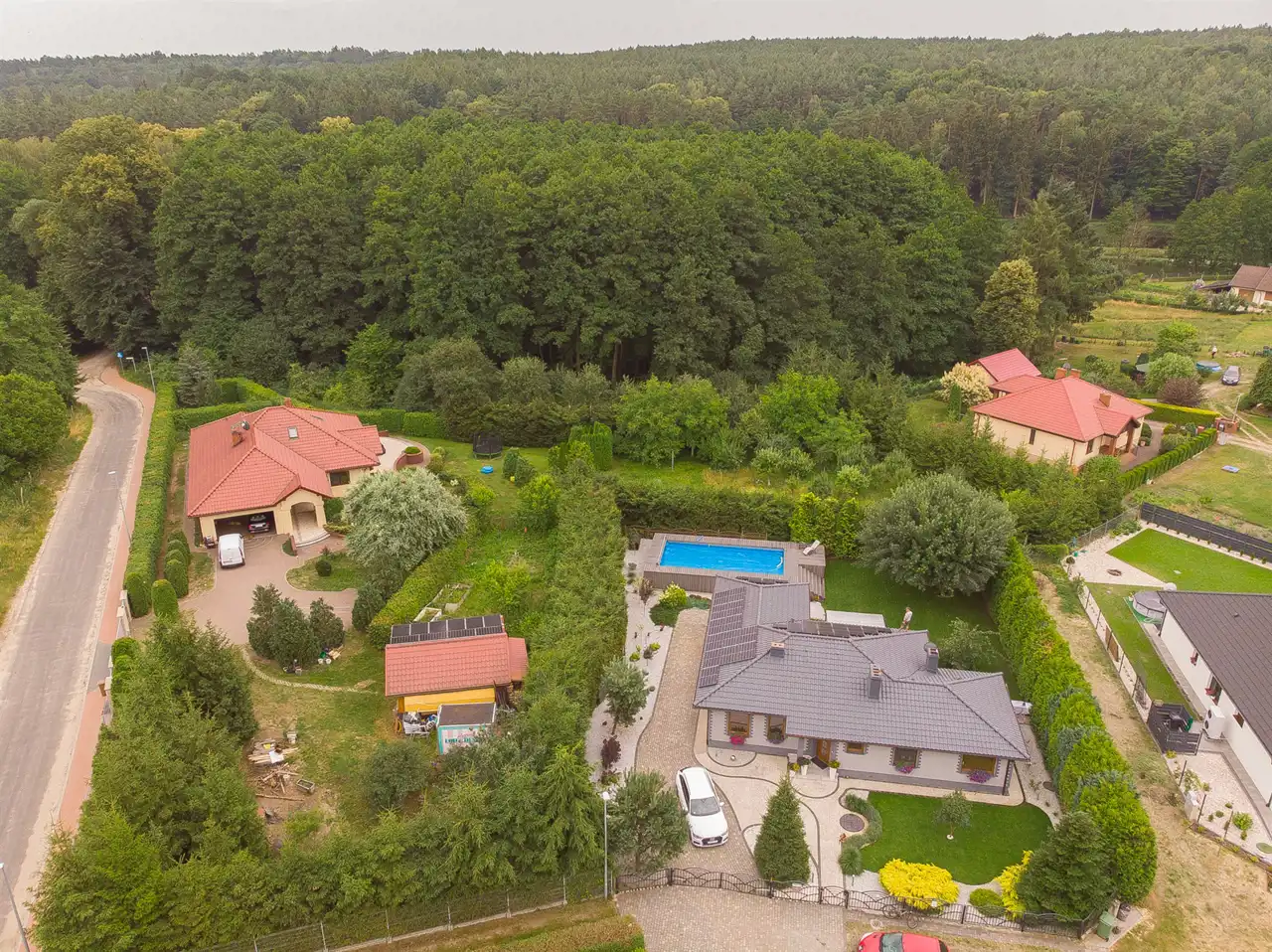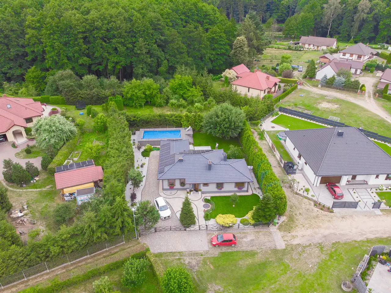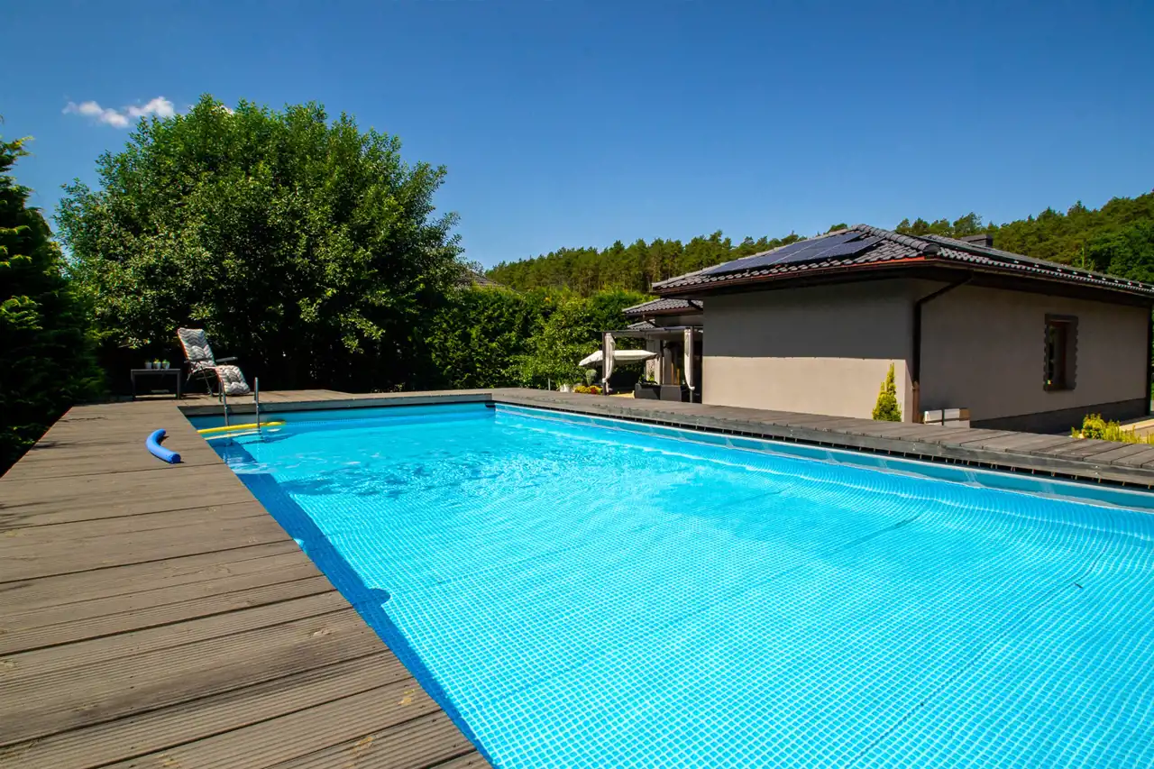 W tylnej części ogrodu basen o wymiarach 9,75m x 4,95m, głębokość: 1,35m. Woda podgrzewana za pomocą indywidualnej pompy ciepła.