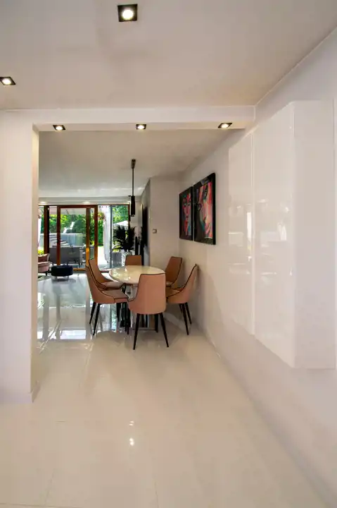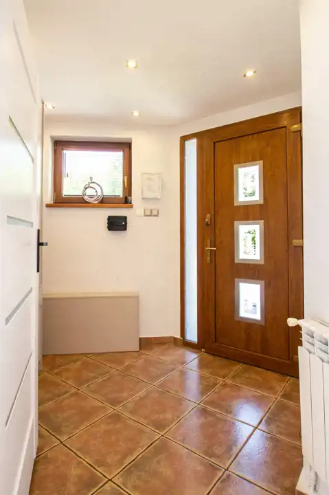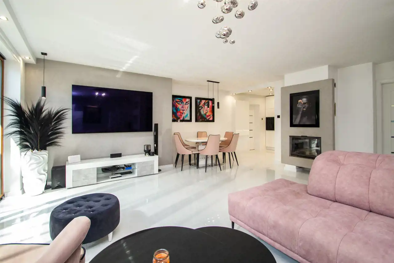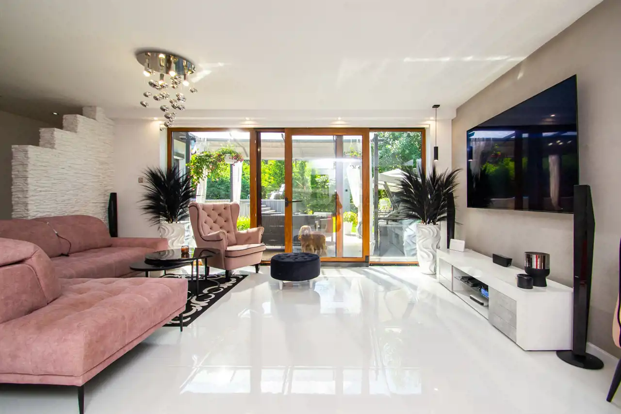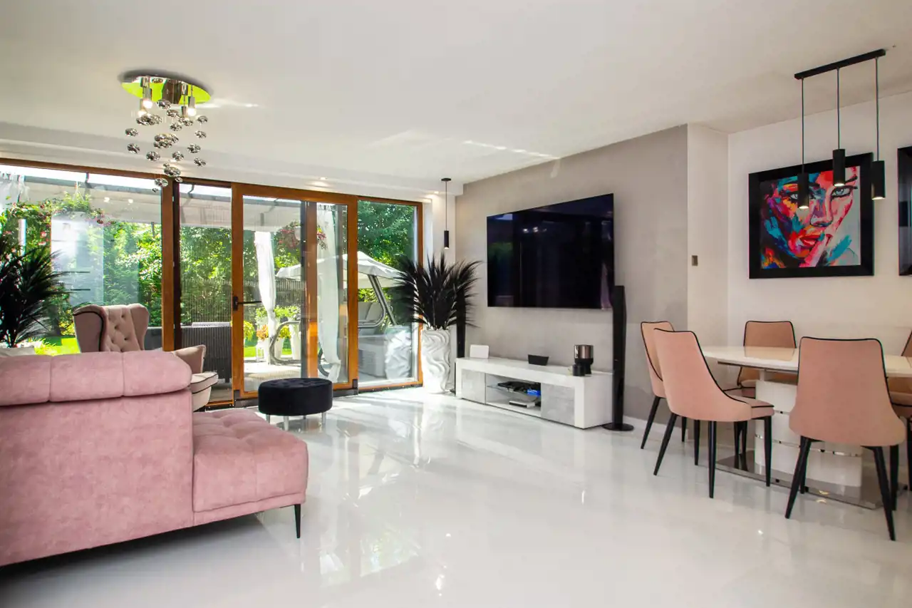 W części dziennej, salon oraz kuchnia, na podłodze kafle z powłoką szklaną odporną na zarysowania.