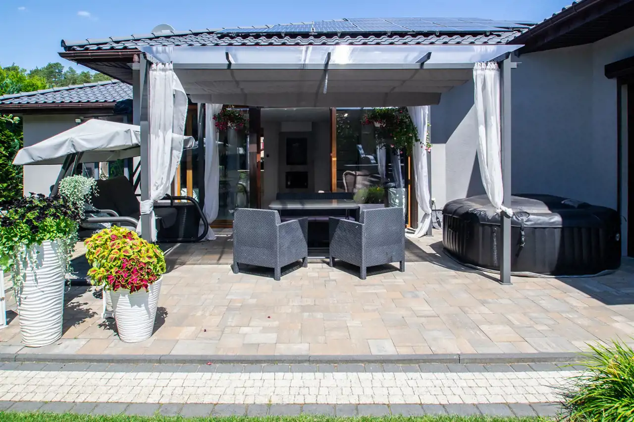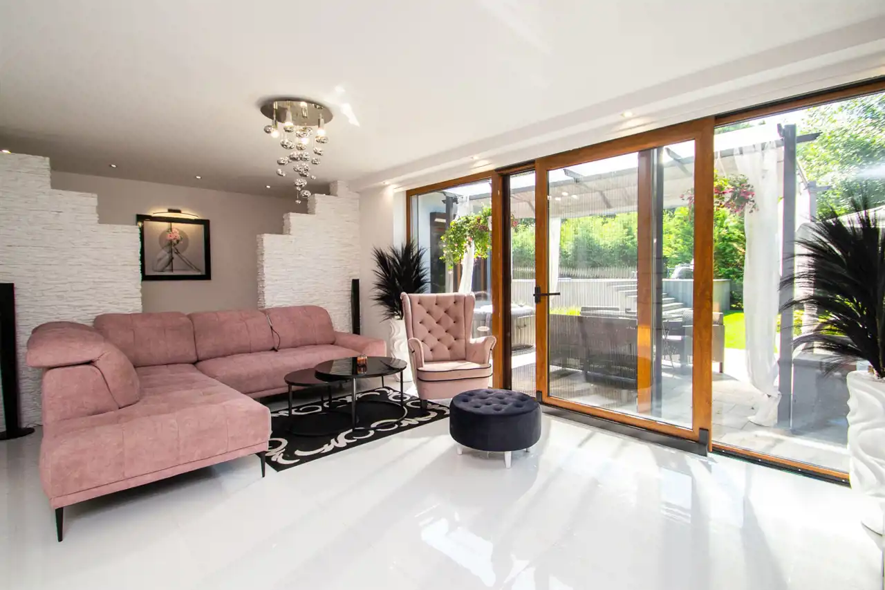 Z salonu wyjście na taras z zaaranżowaną strefą wypoczynku i relaksu w postaci jacuzzi.