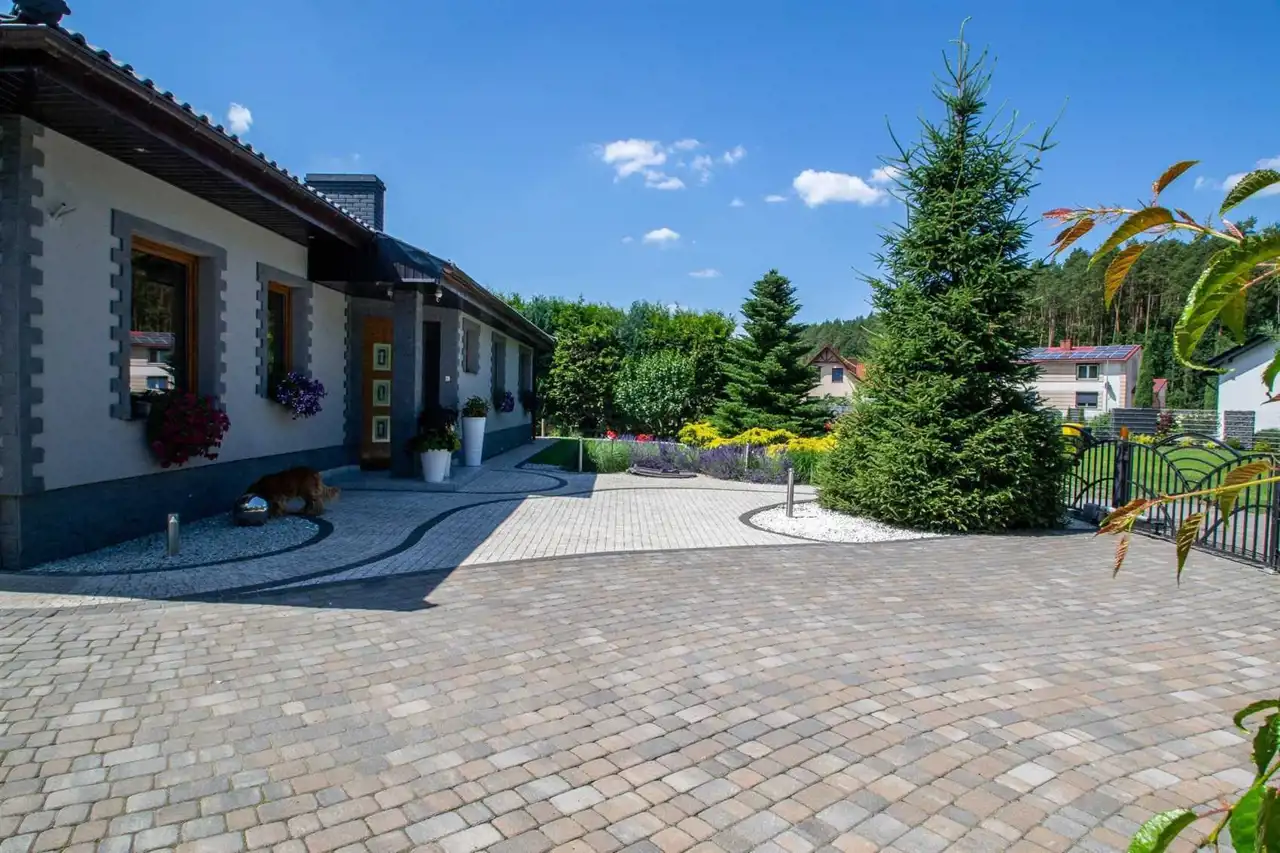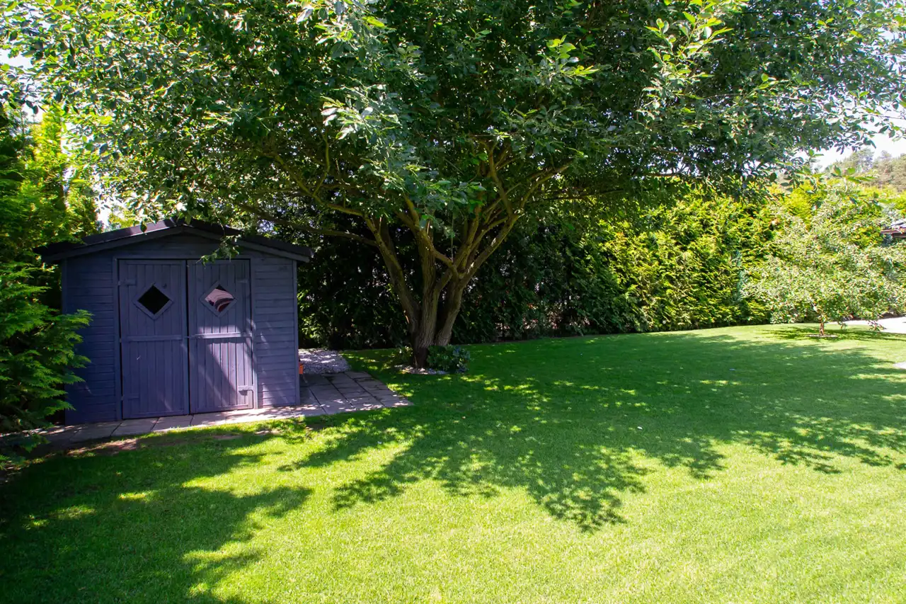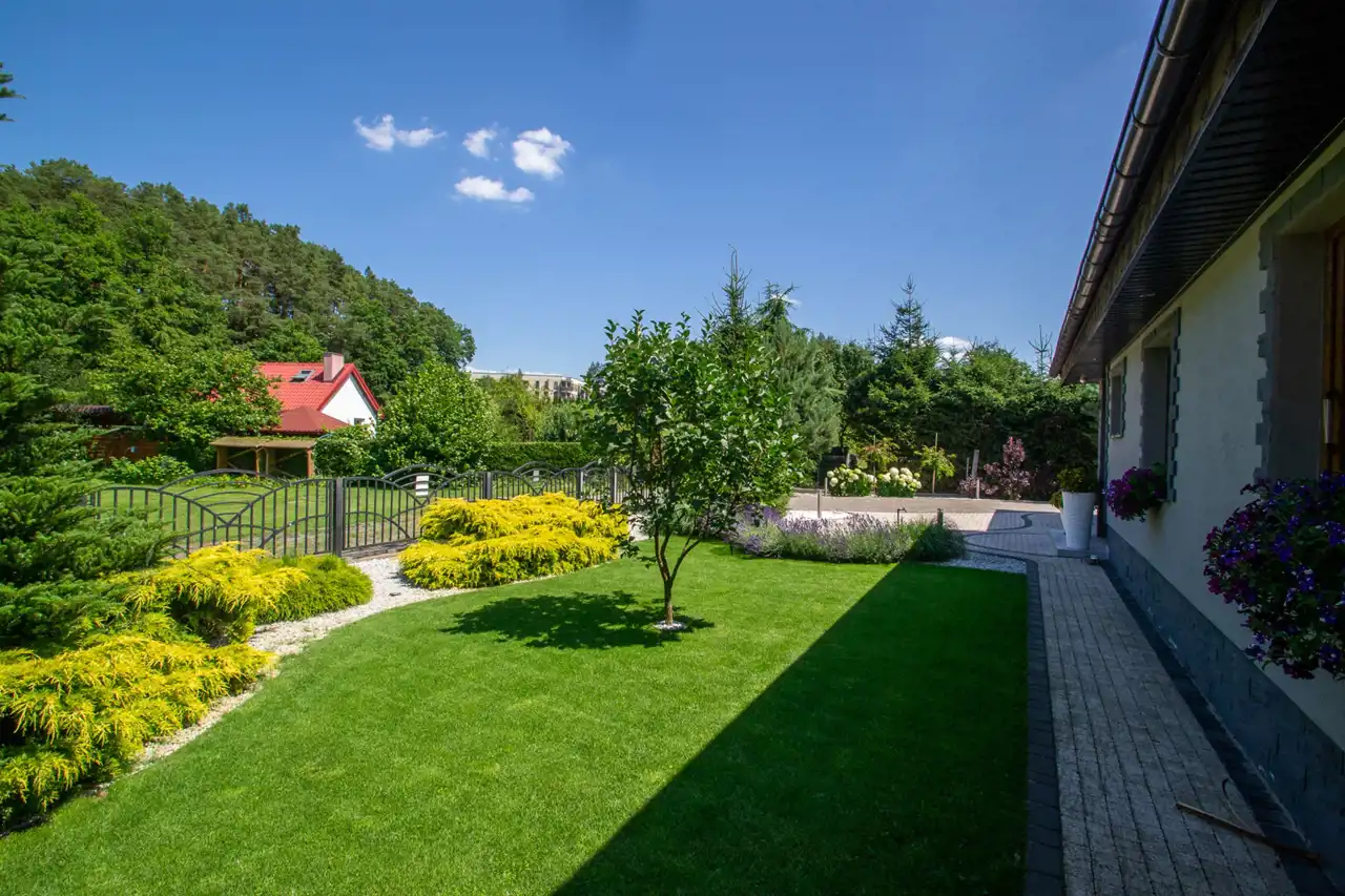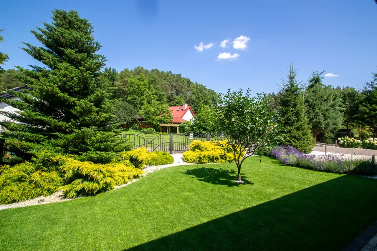Pięknie zagospodarowany ogród zaopatrzony w system automatycznego podlewania sterowanego elektronicznie. Podlewanie ogrodowe z własnej studni.