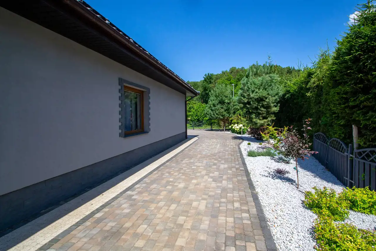 Podjazd, taras oraz komunikacja na posesji wyłożona kostką brukową Terrazzo pikolo oraz starobruk na podłożu betonowym.