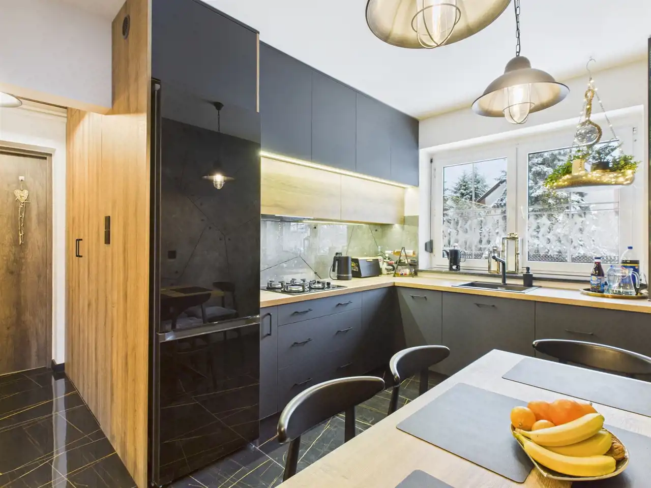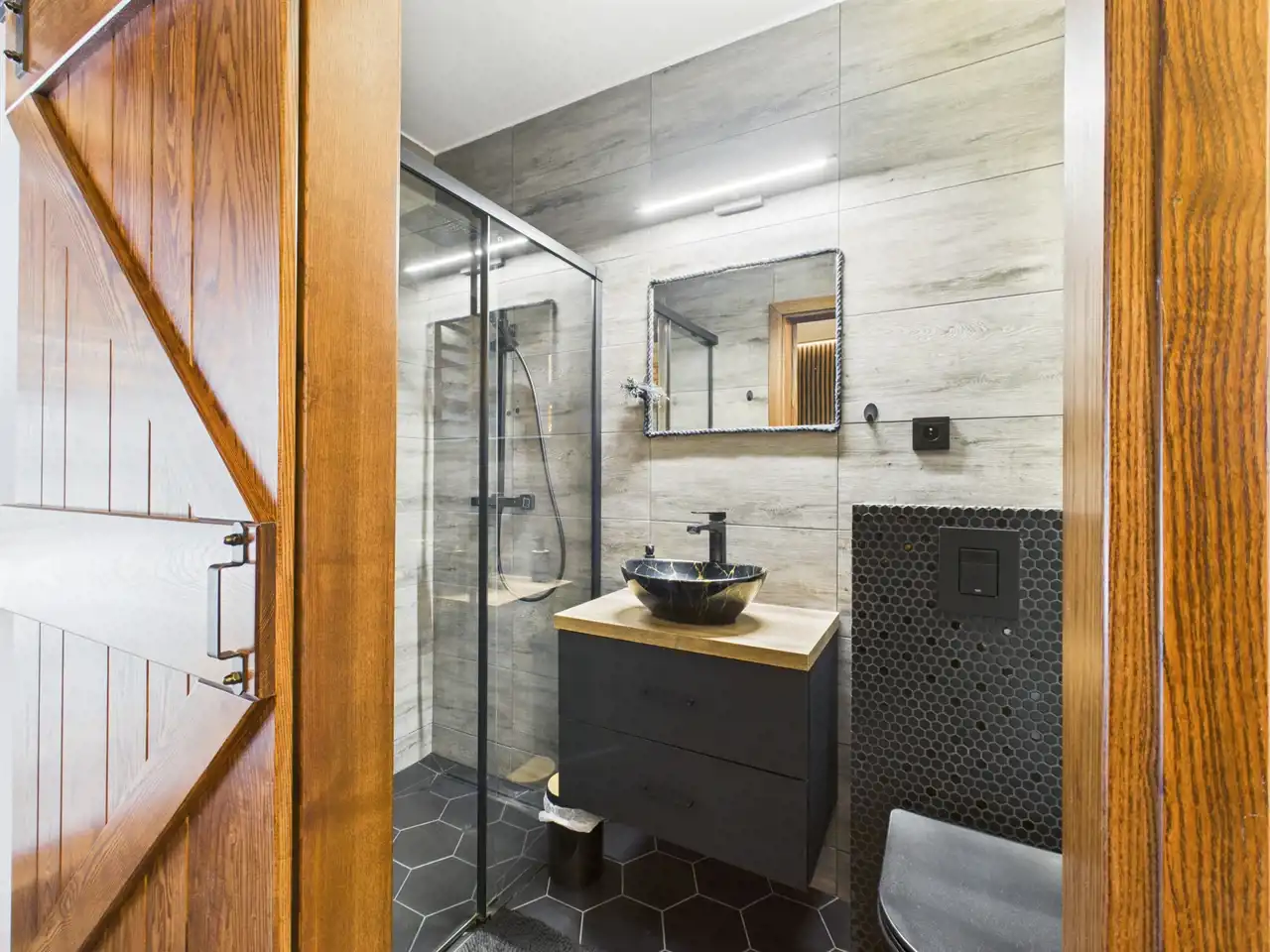 W aranżacji domu wykorzystano m.in. 120-letnią cegłę, nadającą przestrzeni niepowtarzalnego stylu i ciepła. Całość dopełniają piękne detale, takie jak drewniane drzwi przesuwne prowadzące do kuchni i łazienki – rozwiązanie zarówno efektowne, jak i praktyczne.