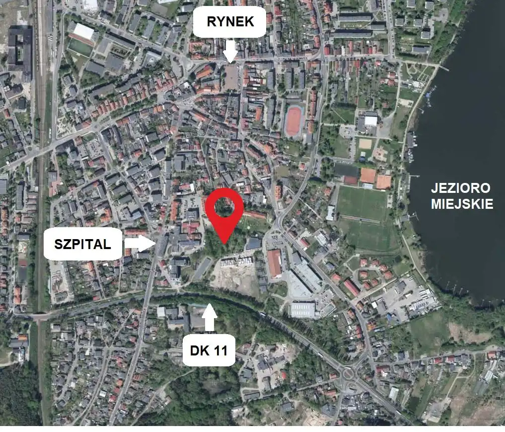 w niewielkiej odległości Jezioro Miejskie oraz droga krajowa nr 11.