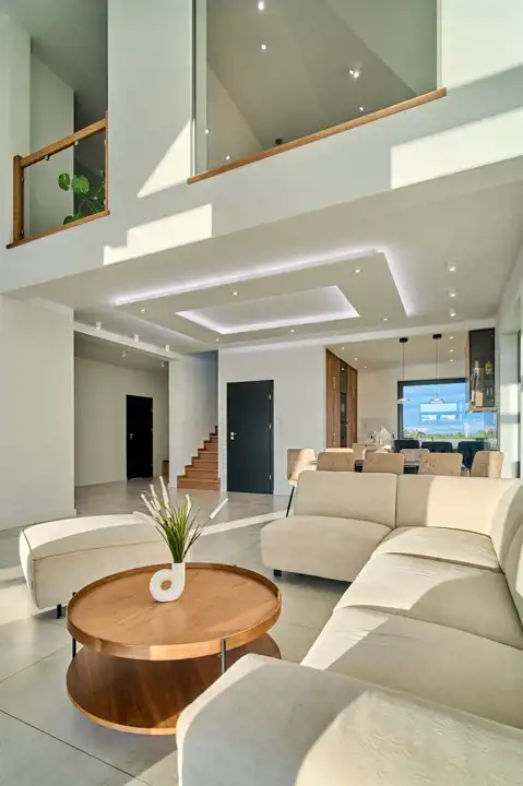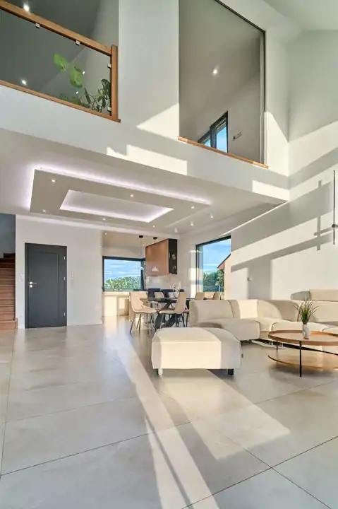 Strefa dzienna domu z otwartym do połaci dachu salonem to komfortowa przestrzeń wypoczynku dla całej rodziny oraz wspaniałe miejsce spotkań z przyjaciółmi.
