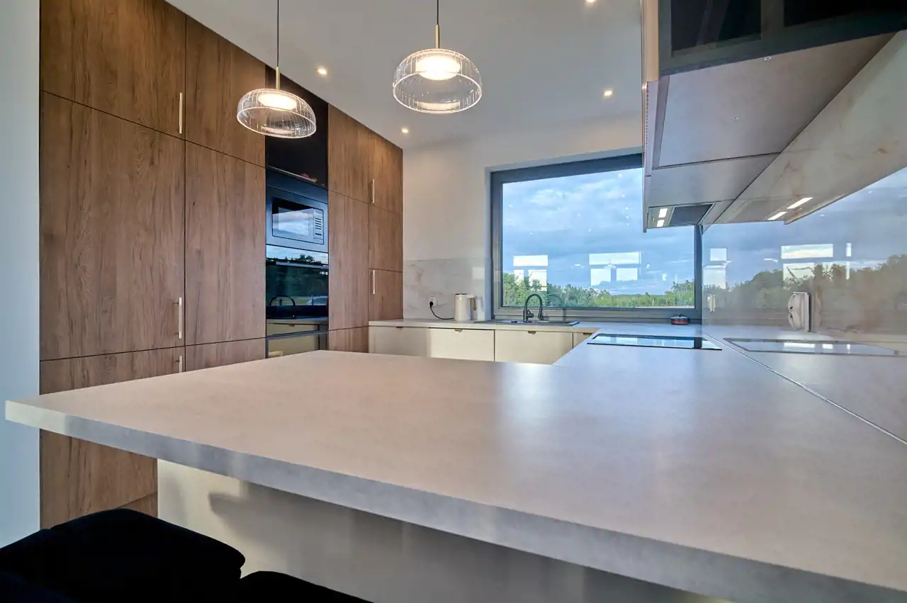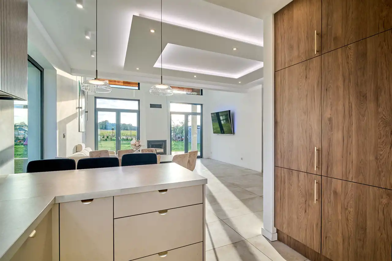 Z salonu bezpośrednie przejście do części jadalnianej z półwyspem i barkiem śniadaniowym oraz do dużej, w pełni wyposażonej i funkcjonalnej kuchni z wysoką zabudową wykonaną pod wymiar, a także spiżarnią, która zdecydowanie ułatwia organizację oraz przechowywanie. Duże drzwi gwarantują wygodną komunikację z ogrodem oraz podkreślają nowoczesny charakter aranżacji. Z holu dostępna jest łazienka (do wykończenia), pokój/gabinet, a także przejście do garażu czy kotłowni i drzwi wejściowe do budynku.