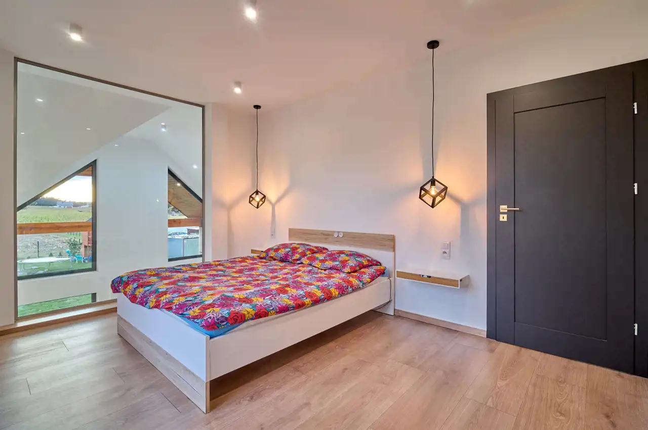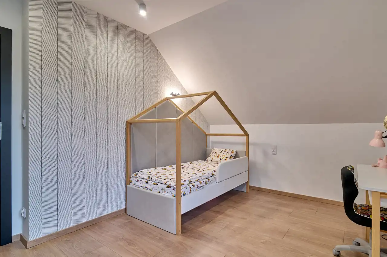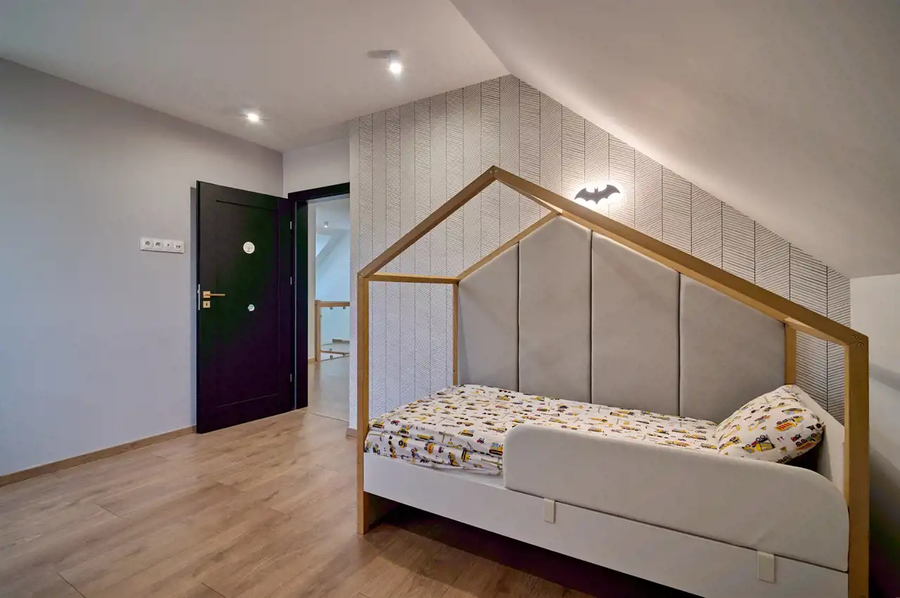 Piętro domu stanowi główna sypialnia z obszerną garderobą oraz przeszkloną ścianą z widokiem na okolicę i antresolę. Dwa identyczne powierzchniowo pokoje, wyposażona łazienka – pokój kąpielowy, a całość przestrzeni poddasza uzupełnia pralnia.