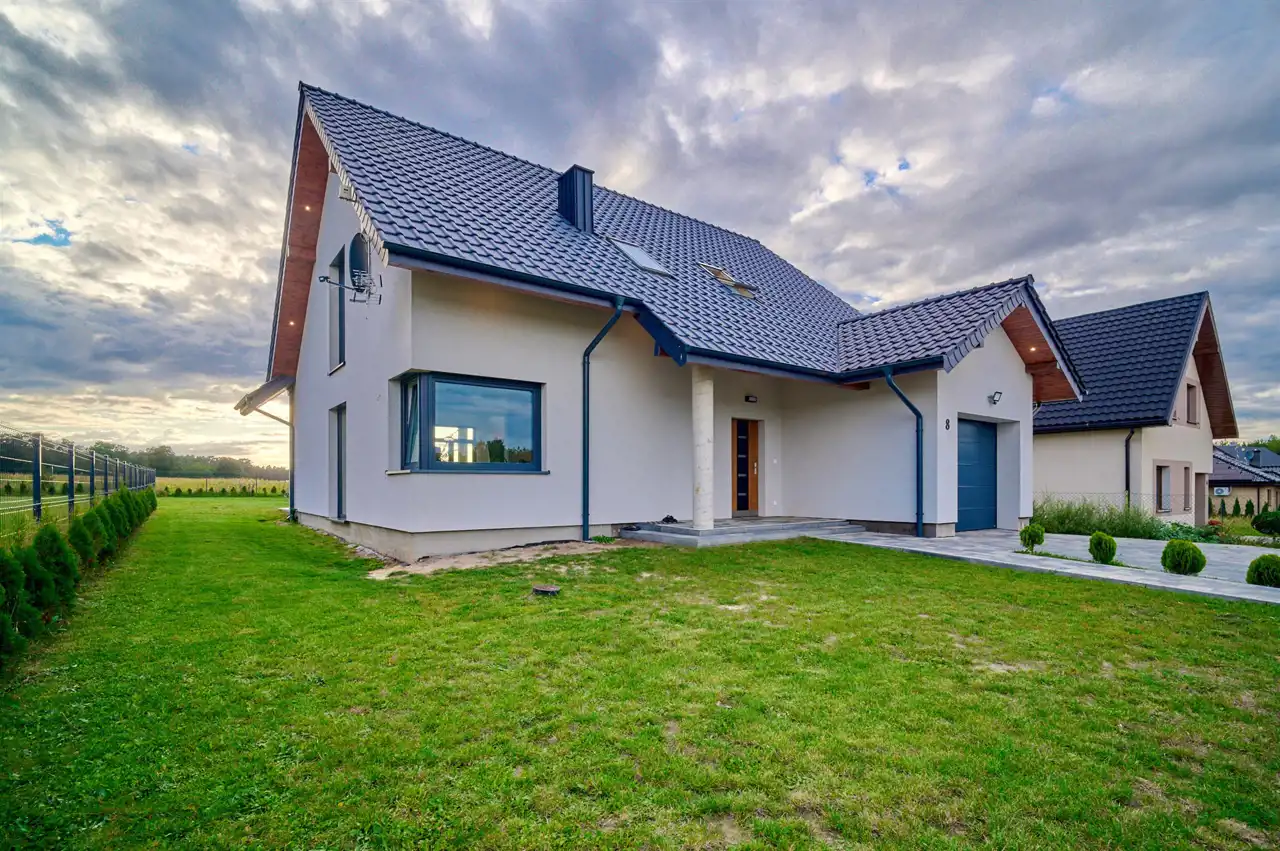 Dom wybudowany metodą tradycyjną przy użyciu wysokiej klasy materiałów, ogrzewany pompą ciepła, w salonie zainstalowany również kominek, który umożliwia dodatkowe oszczędności energii zużywanej w sezonie grzewczym oraz daje wyjątkowy klimat w zimowe wieczory. W całym domu zastosowano ogrzewanie podłogowe oraz okna trzyszybowe. Wejście do budynku zadaszone, chodnik oraz podjazd do garażu z kostki w układzie różnoformatowym. Na tyłach budynku taras z dużymi przeszkleniami, które wprowadzają do wnętrza mnóstwo naturalnego światła i jednocześnie podnoszą jego walory dekoracyjne.