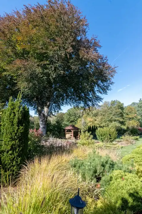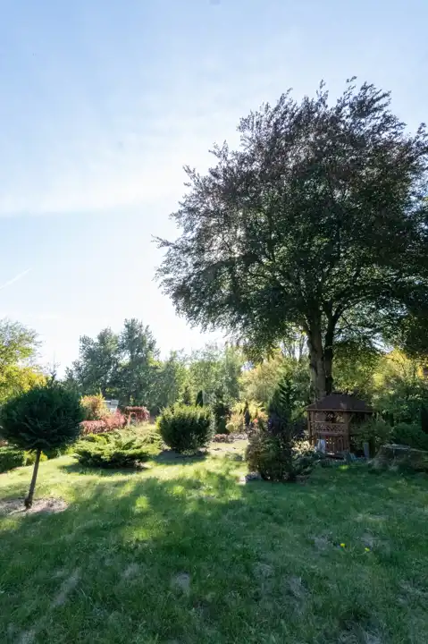Całość usytuowana jest na dużej działce o powierzchni 1645 m², która została częściowo zaaranżowana zasadzoną roślinnością, a uroku dodaje duży majestatyczny dąb tuż przy altance.