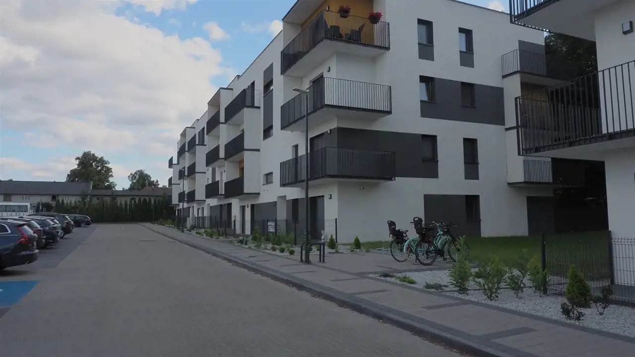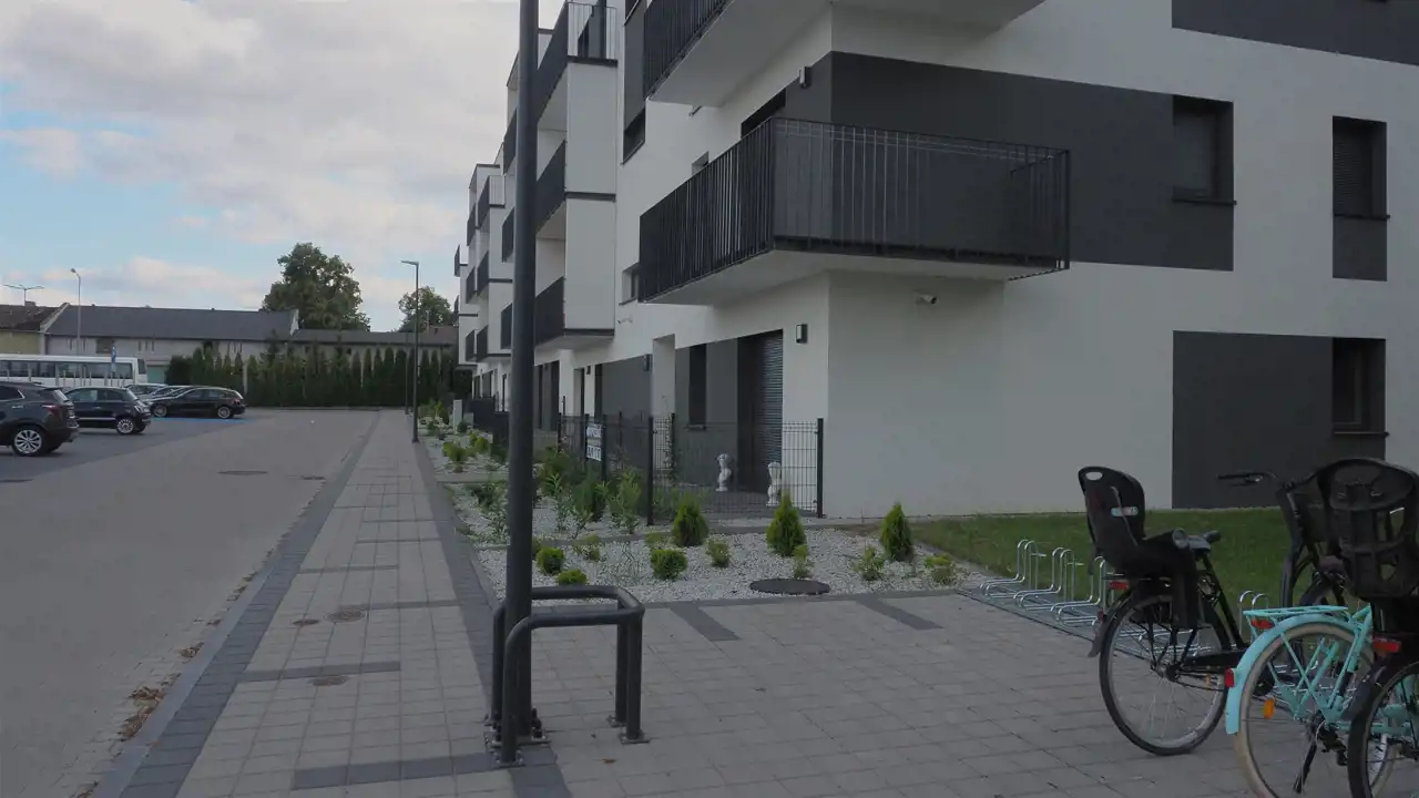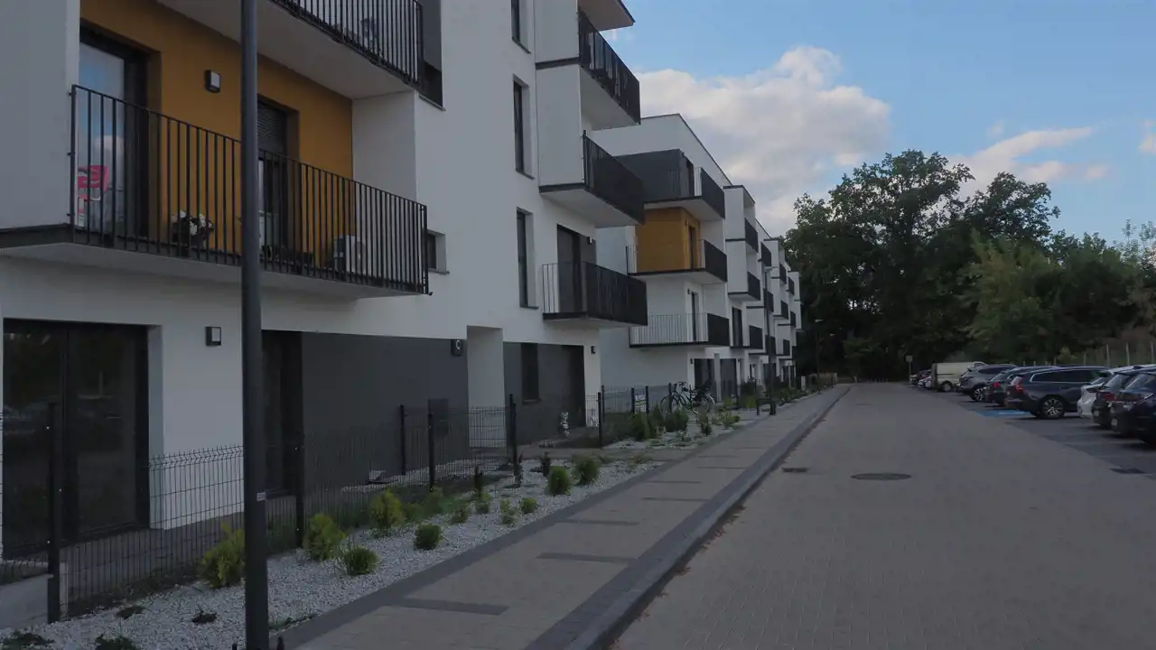 Blok z 2023 roku, przed blokiem znajduje się parking z dostępnymi miejscami parkingowymi dla mieszkańców.