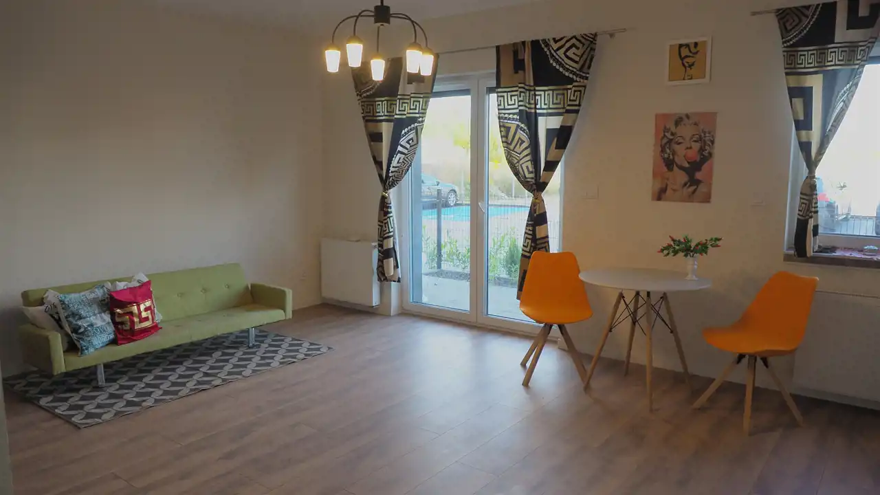 - salonu z aneksem kuchennym o pow. 23,09 m2, z wyjściem na ogródek