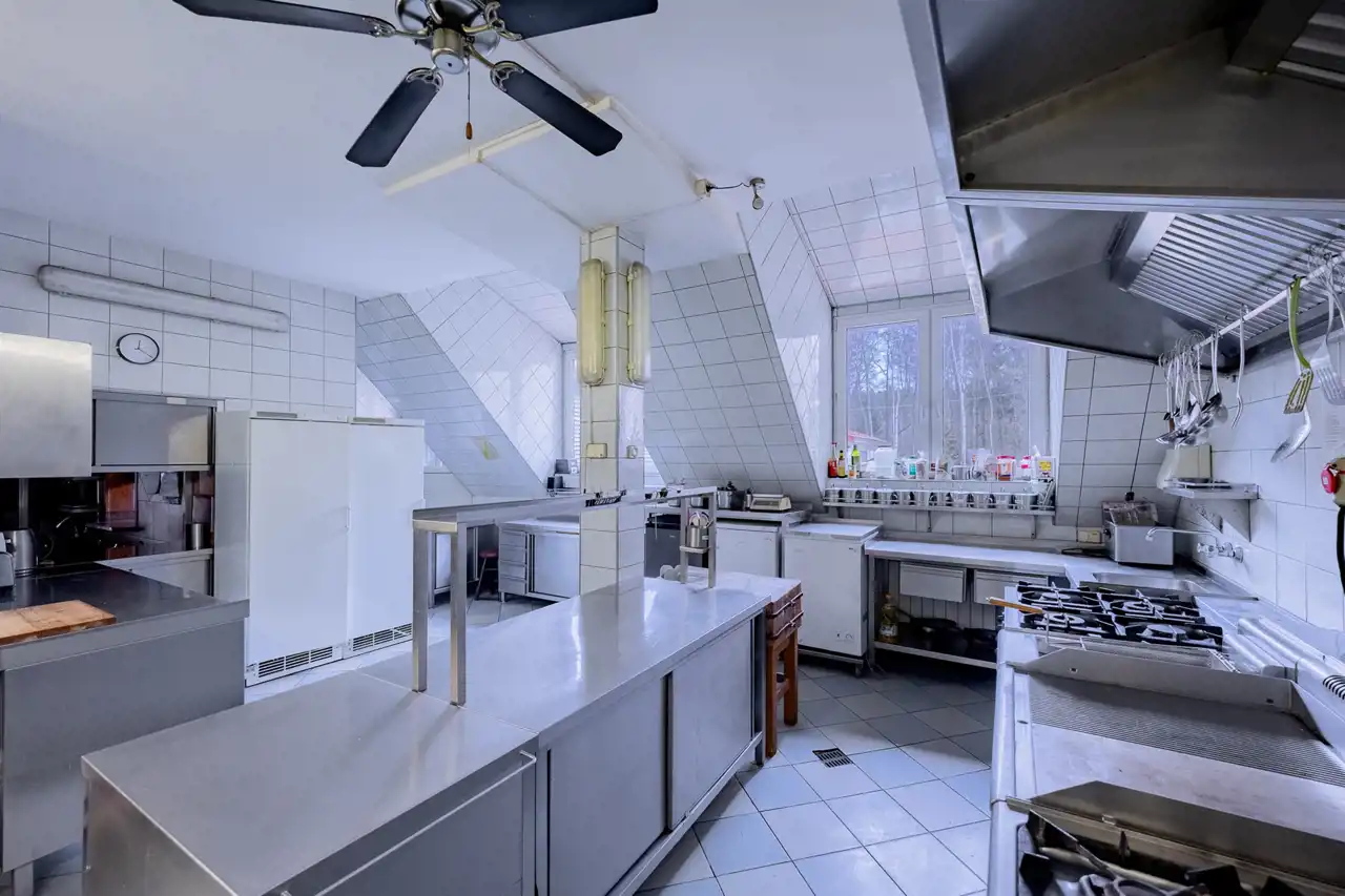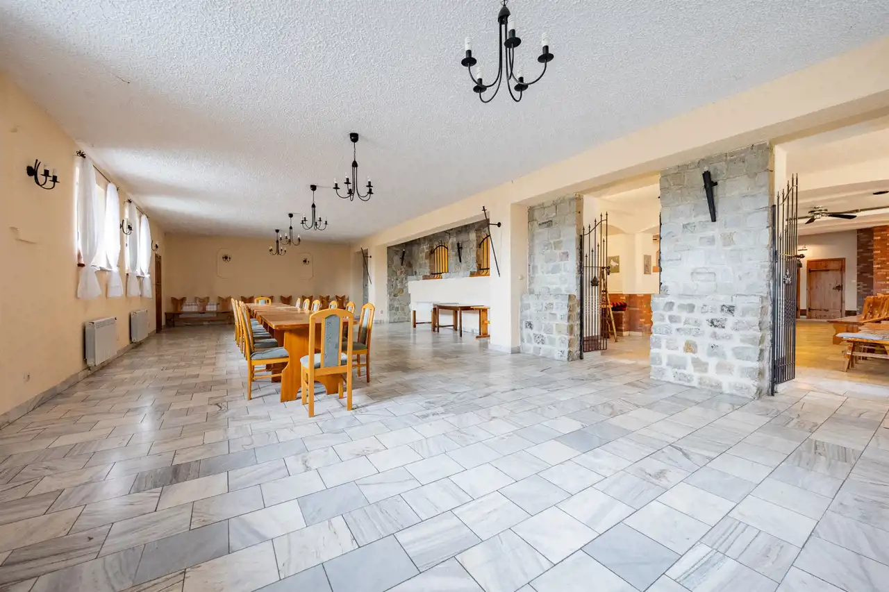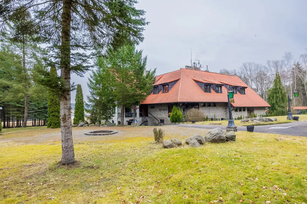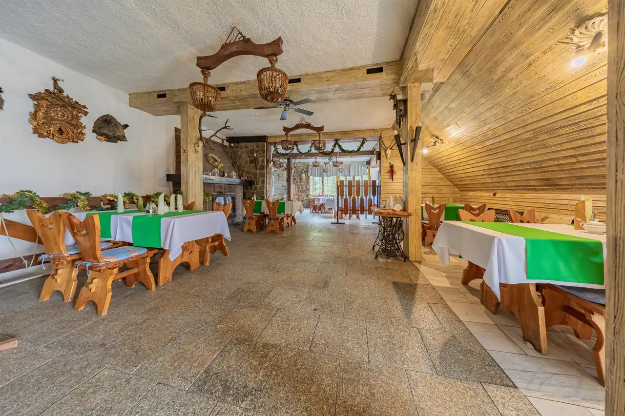 The property includes two fully equipped buildings with a total usable area of approx. 1,500 m², 54+ accommodation places, two restaurants, event spaces and independent technical infrastructure (deep well, private sewage pumping station, oil and wood heating, fiber‑optic internet).