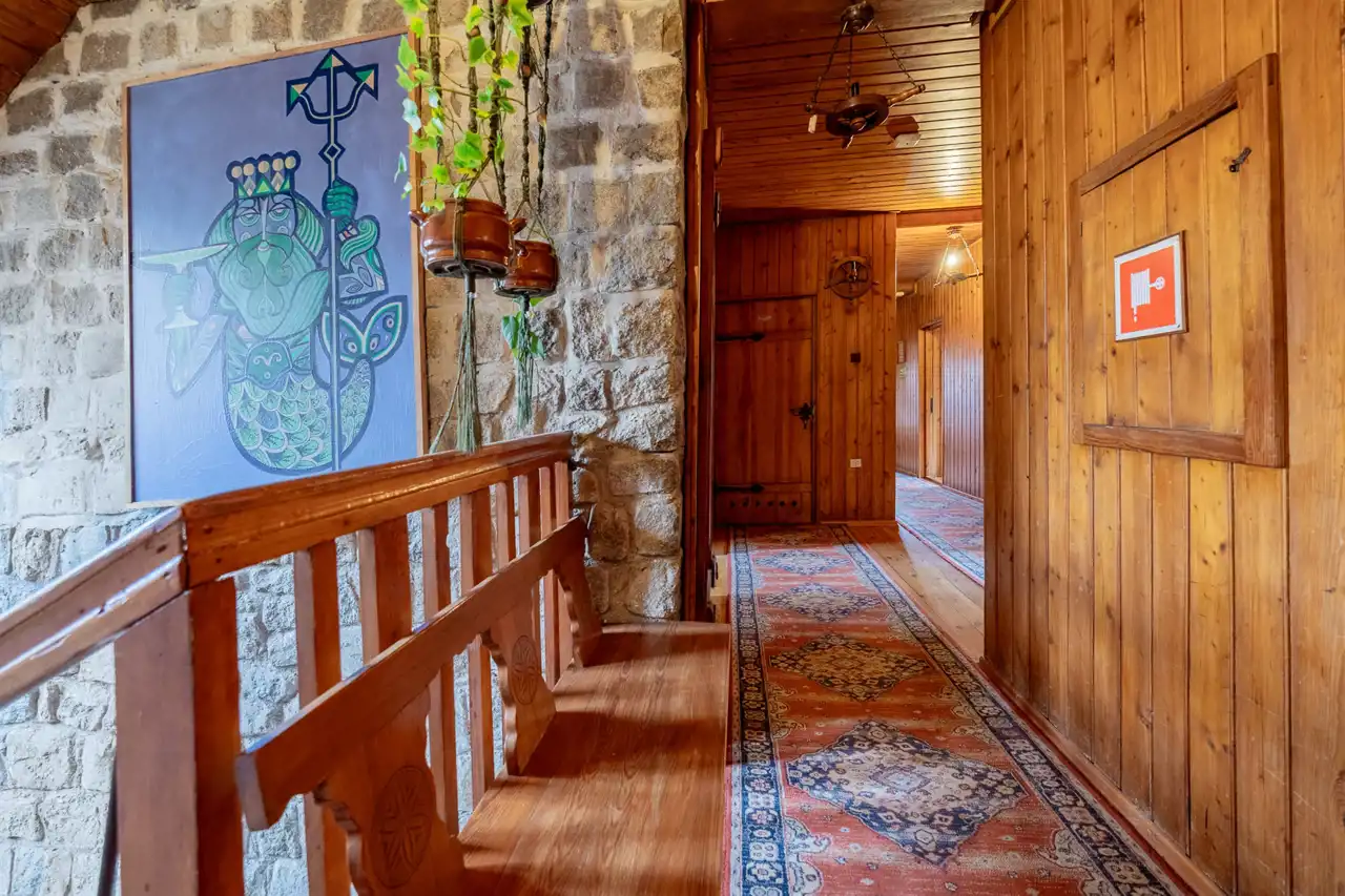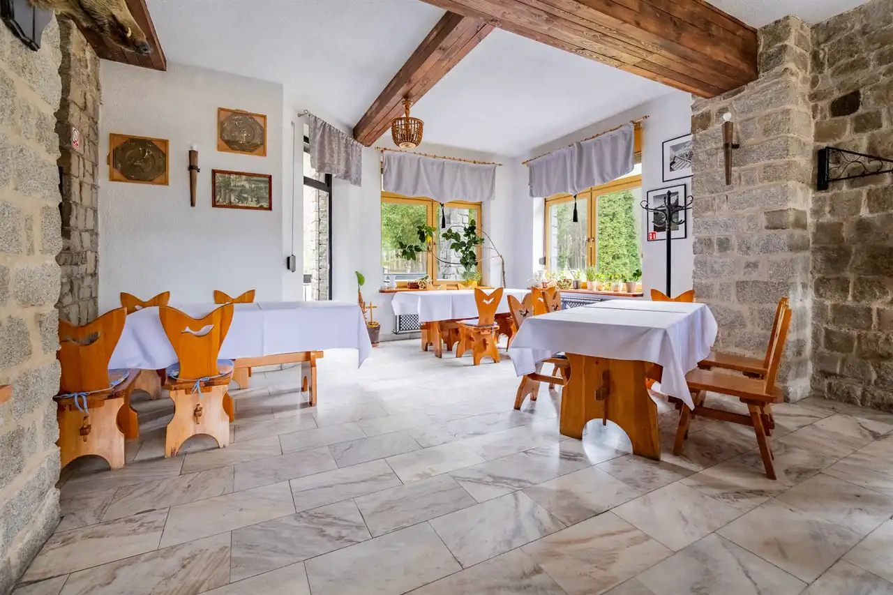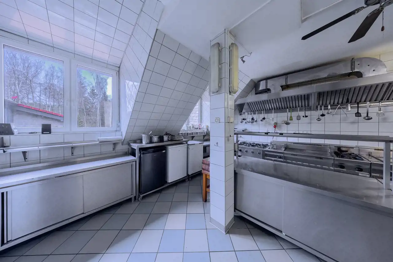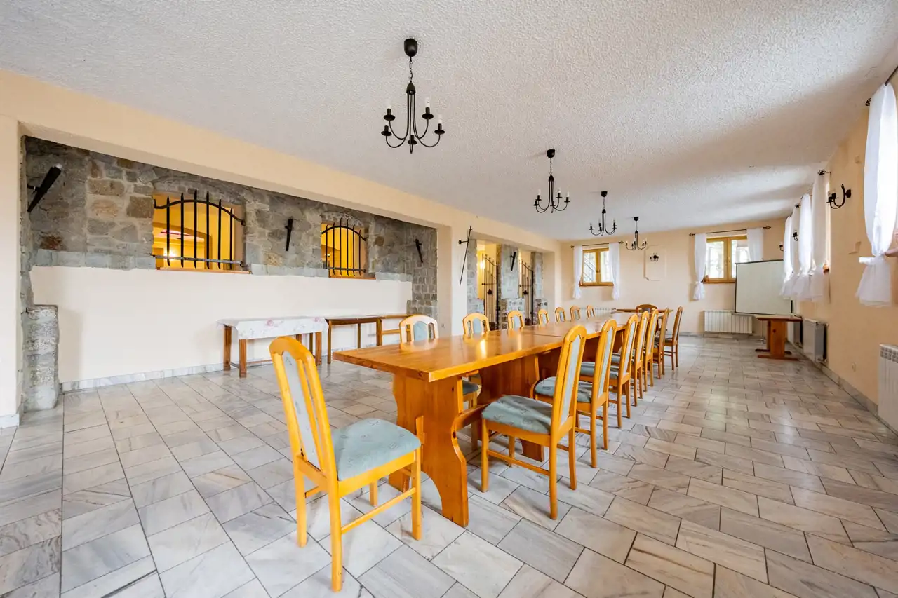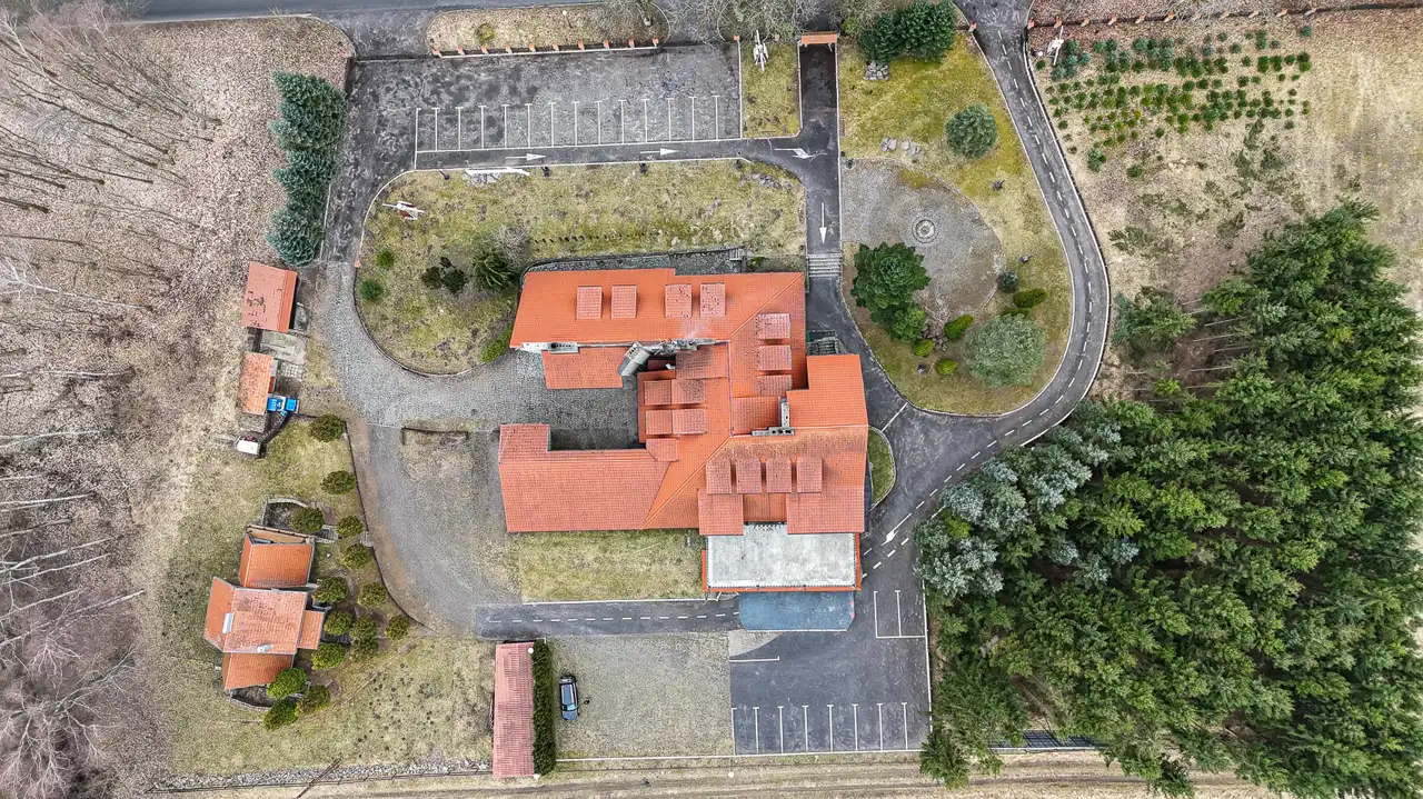 The property includes two fully equipped buildings with a total usable area of approx. 1,500 m², 54+ accommodation places, two restaurants, event spaces and independent technical infrastructure (deep well, private sewage pumping station, oil and wood heating, fiber‑optic internet).