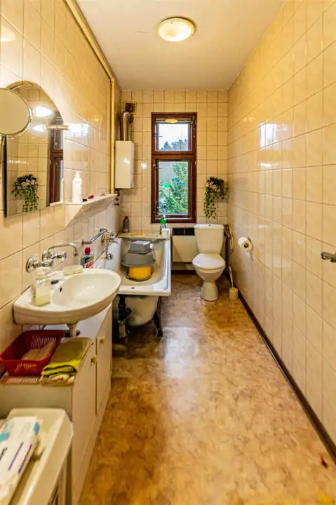 Okna PCV, drewniane okno w łazience. Rolety wewnętrzne.