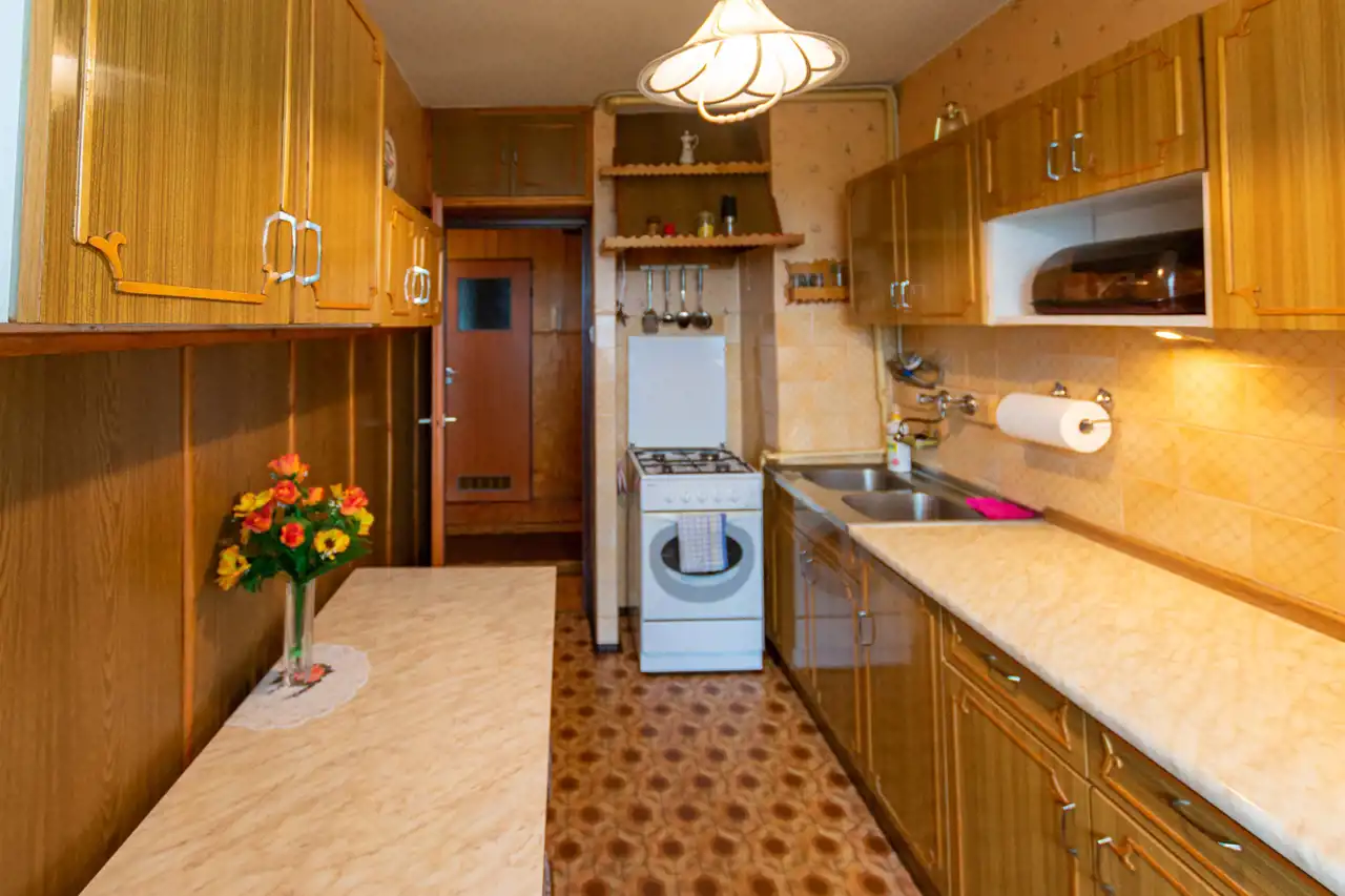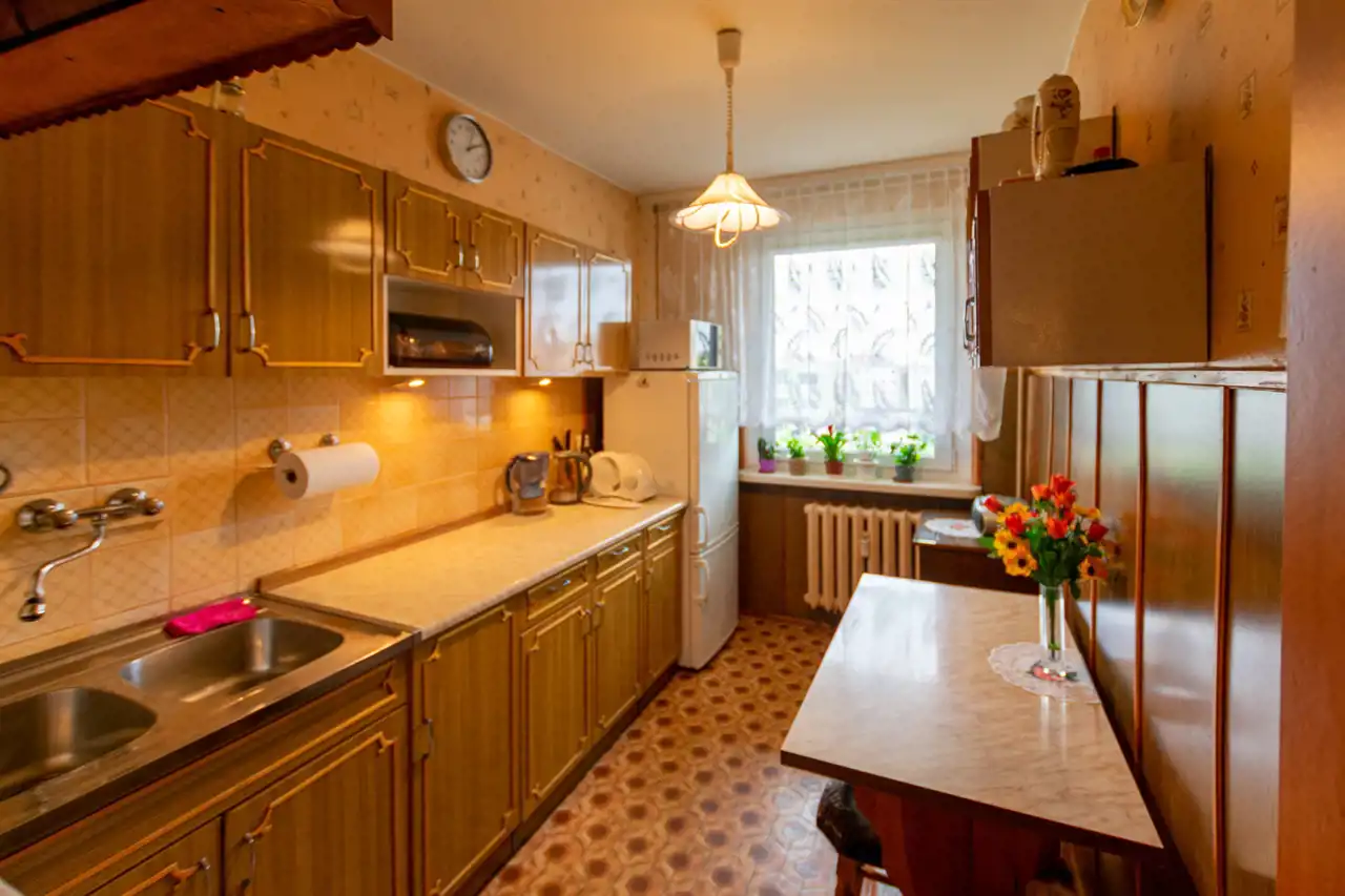 Kuchnia wyposażona w meble kuchenne, kuchenkę gazową, lodówko - zamrażarkę i zlewozmywak z baterią.
