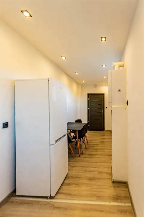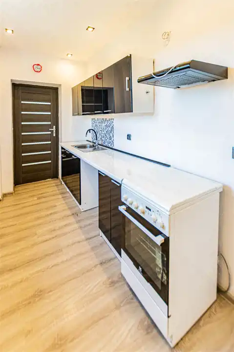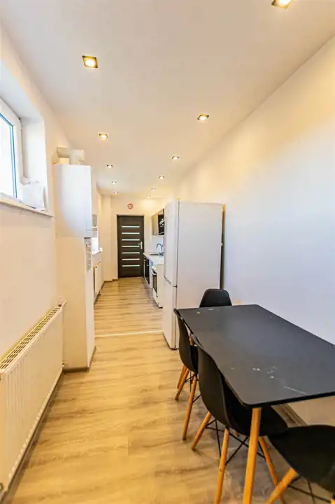 W kuchni meble kuchenne wraz ze sprzętem AGD (kuchenka gazowa, lodówko - zamrażarka, okap, stół + krzesła).