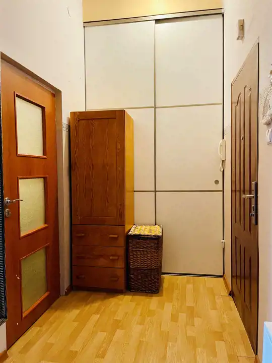 przedpokoju z dużą wnęką, która obecnie pełni funkcję dodatkowej sypialni.