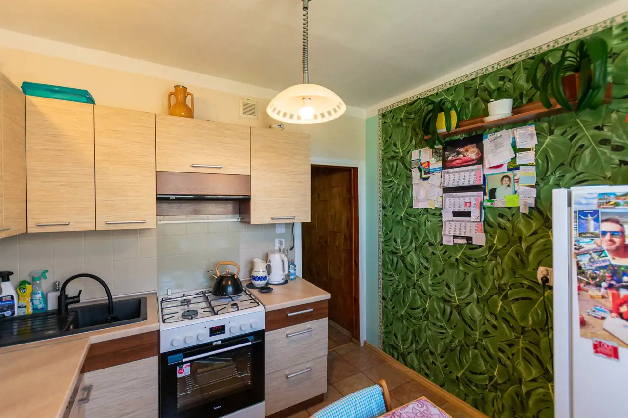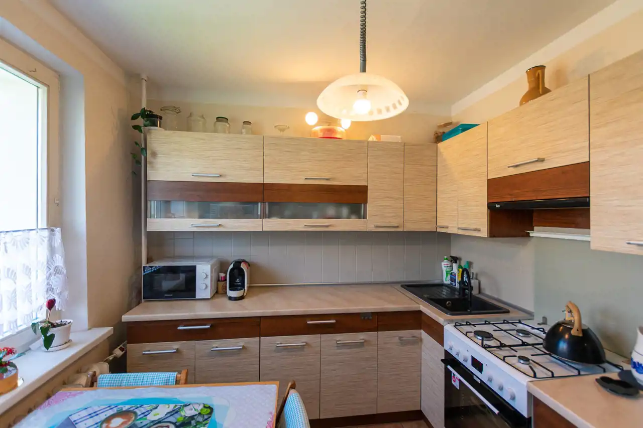 - kuchnia wyposażona w meble kuchenne, kuchenkę gazową i zlewozmywak z baterią
