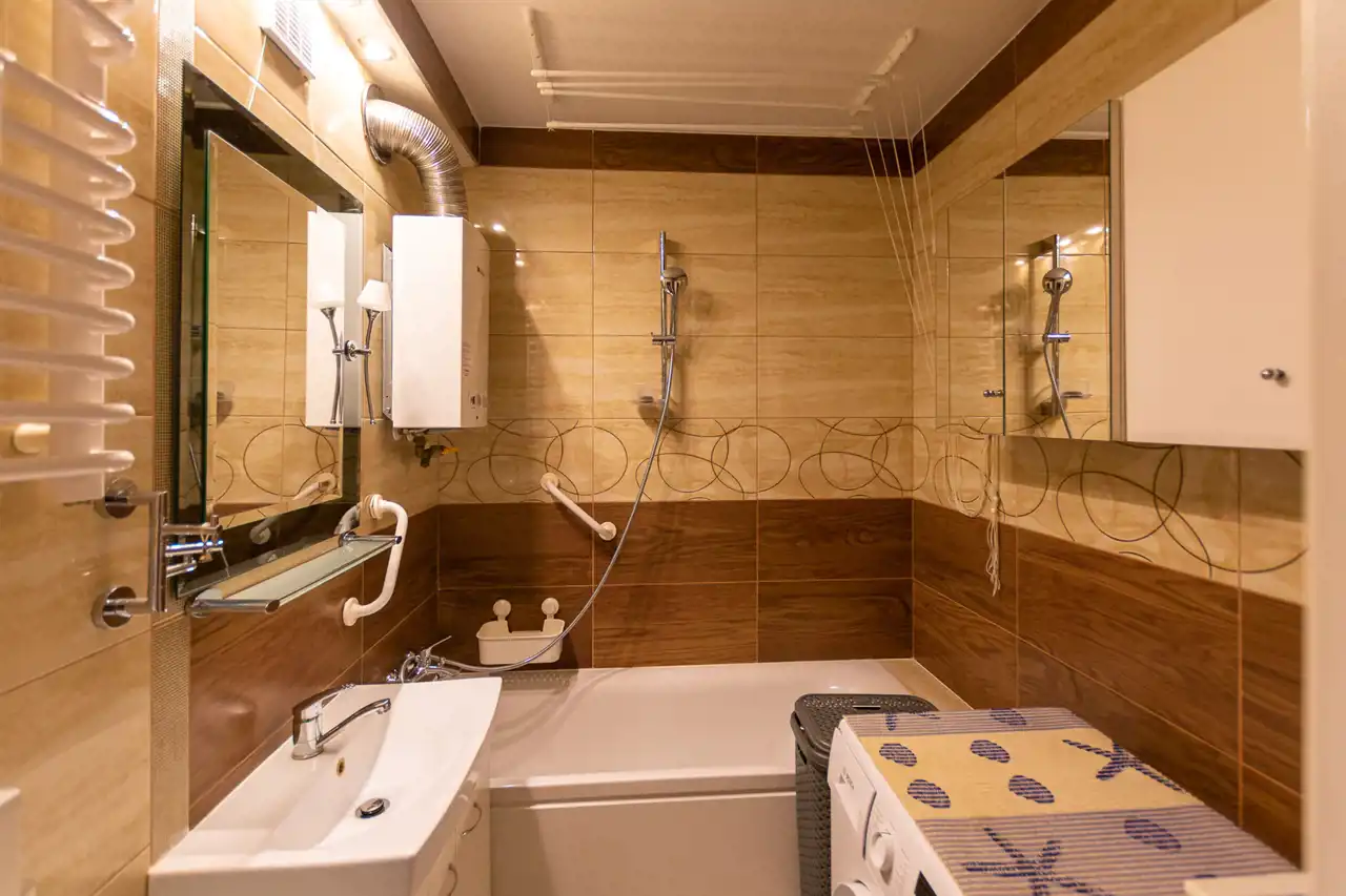 - w łazience wanna, umywalka z szafką i lustro, płytki ceramiczne na ścianach i podłodze - nowego typu