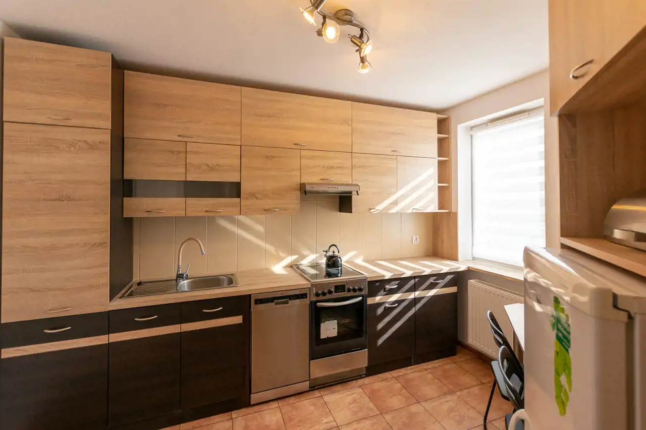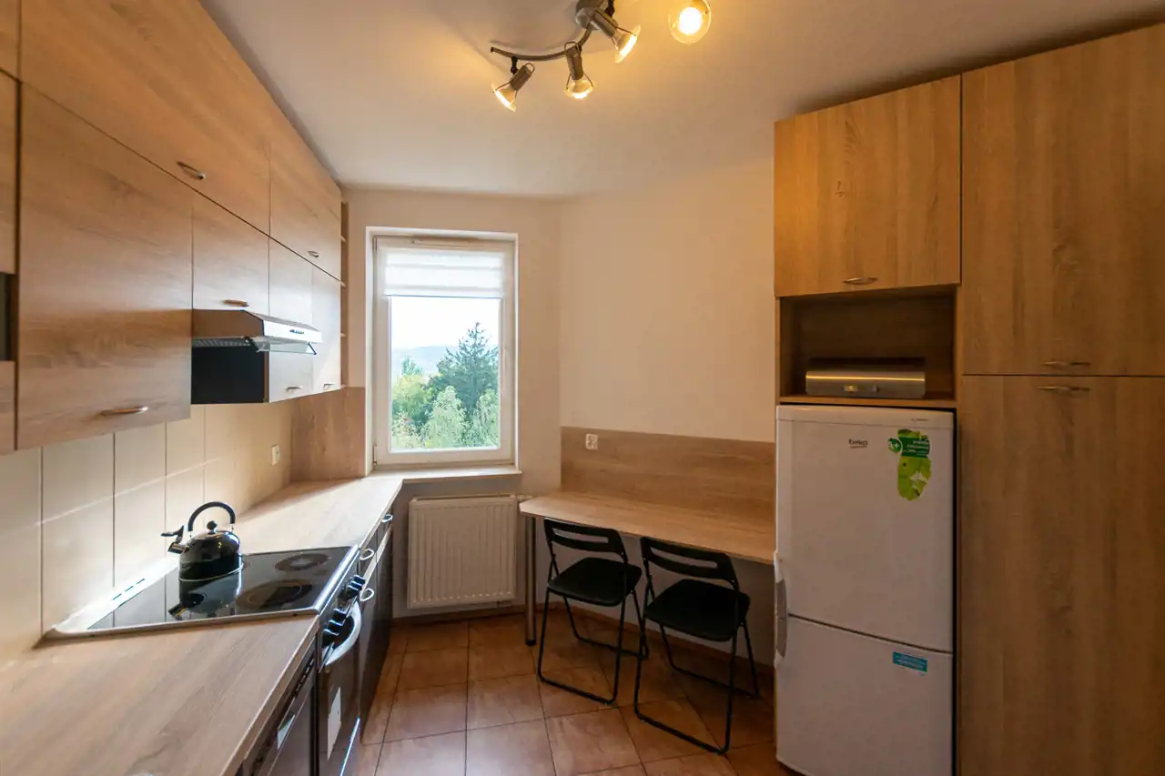 - kuchnia i łazienka w pełni wyposażone - meble kuchenne, płyta indukcyjna, piekarnik, zmywarka, lodówka i nowa pralka