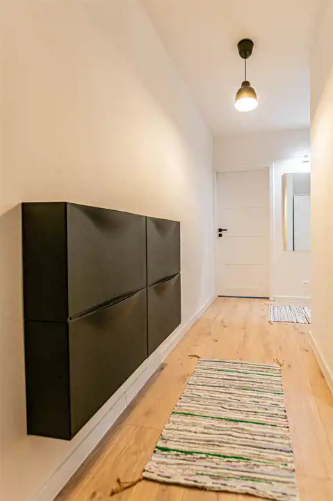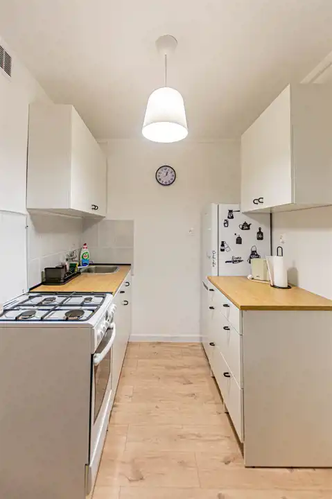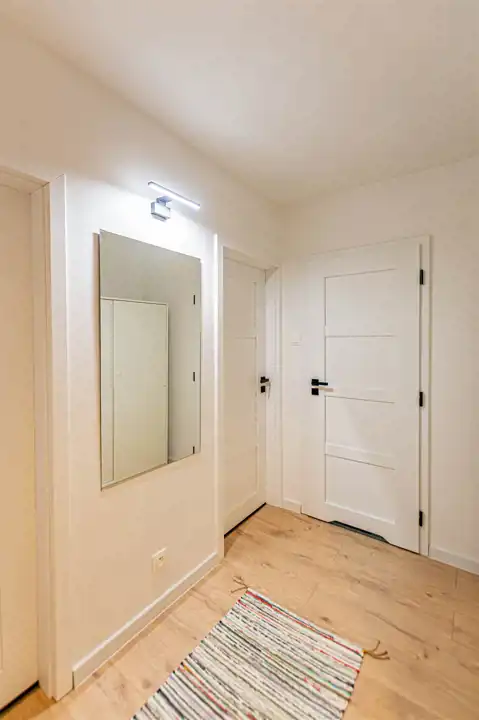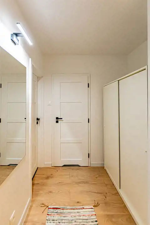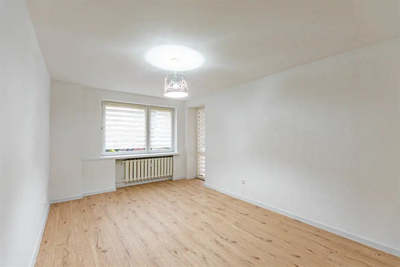 - W pokojach, kuchni i przedpokoju na podłogach panele, w łazience na podłodze terakota