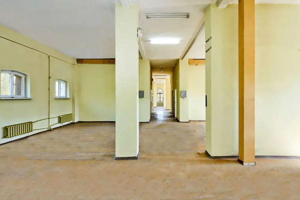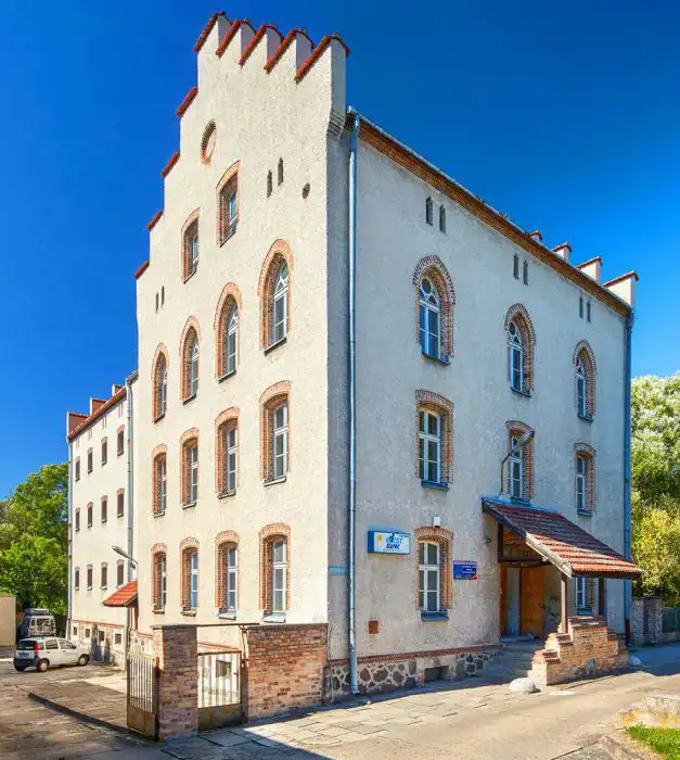Budynek 3-kondygnacyjny o powierzchni: 1382,80 m2, wolnostojący, całkowicie podpiwniczony, wykonany w technologii tradycyjnej. Fundamenty z kamienia, ściany konstrukcyjne i działowe z cegły ceramicznej. Stolarka okienna PVC ora drewniana, okna częściowo kratowane. Drzwi wewnętrzne drewniane, płycinowe. Drzwi wejściowe z profili aluminiowych, przeszklone. Podłogi na parterze wyłożone terakotą i wykładziną winylową. Podłogi w piwnicy betonowe. Schody żelbetowe, w piwnicy betonowe.
